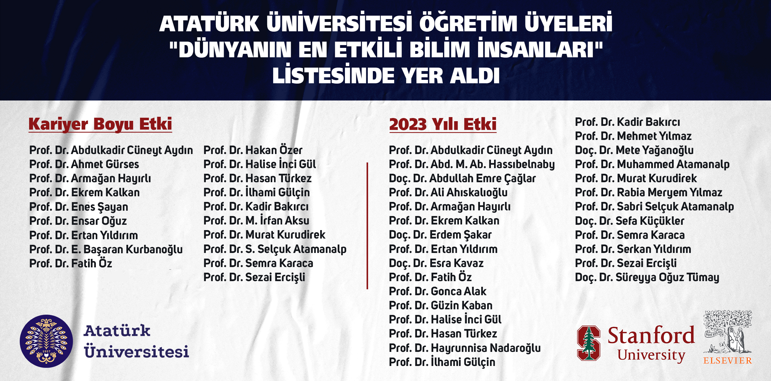 While the list in question was announced in two different categories, career-long and last year, 28 scientists from Atatürk University were entitled to enter the ‘Last Year’ list of scientists and 19 scientists were entitled to enter the ‘Career-Long Impact’ list. In Turkey, 1518 researchers were included in the ‘last year’ list and 1172 scientists were included in the ‘career-long’ list.