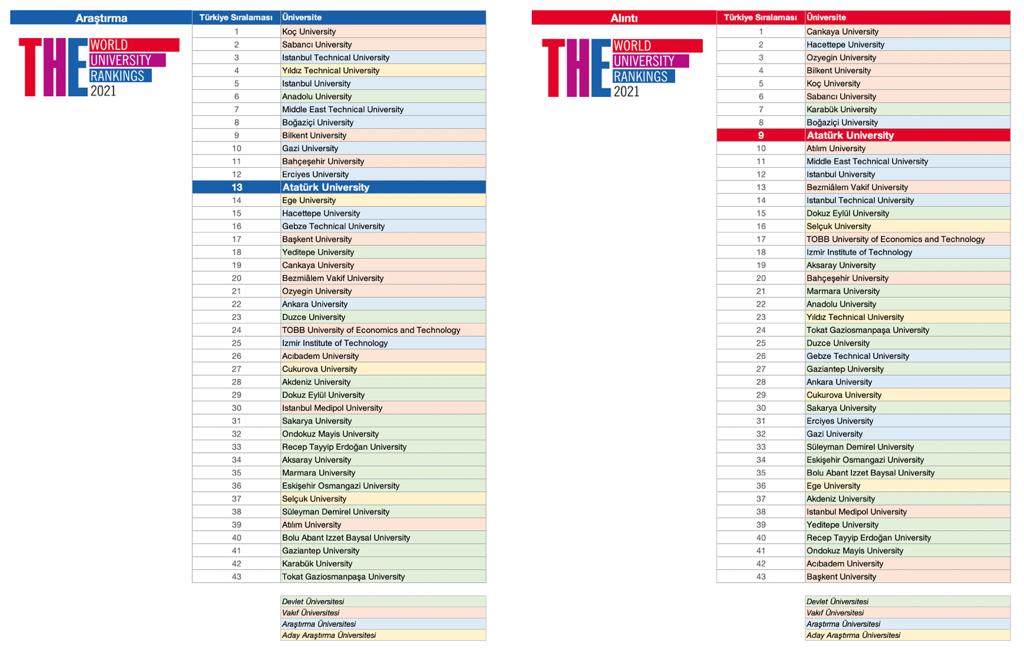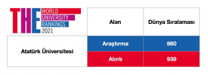 In the World University Rankings 2021 list, which includes more than 1,500 universities from 93 countries; Atatürk University ranked 860th in the world in the field of research and 938th in the field of citations, which takes into account the references to scientific publications, and succeeded in being among the top 1000 among the World Universities.