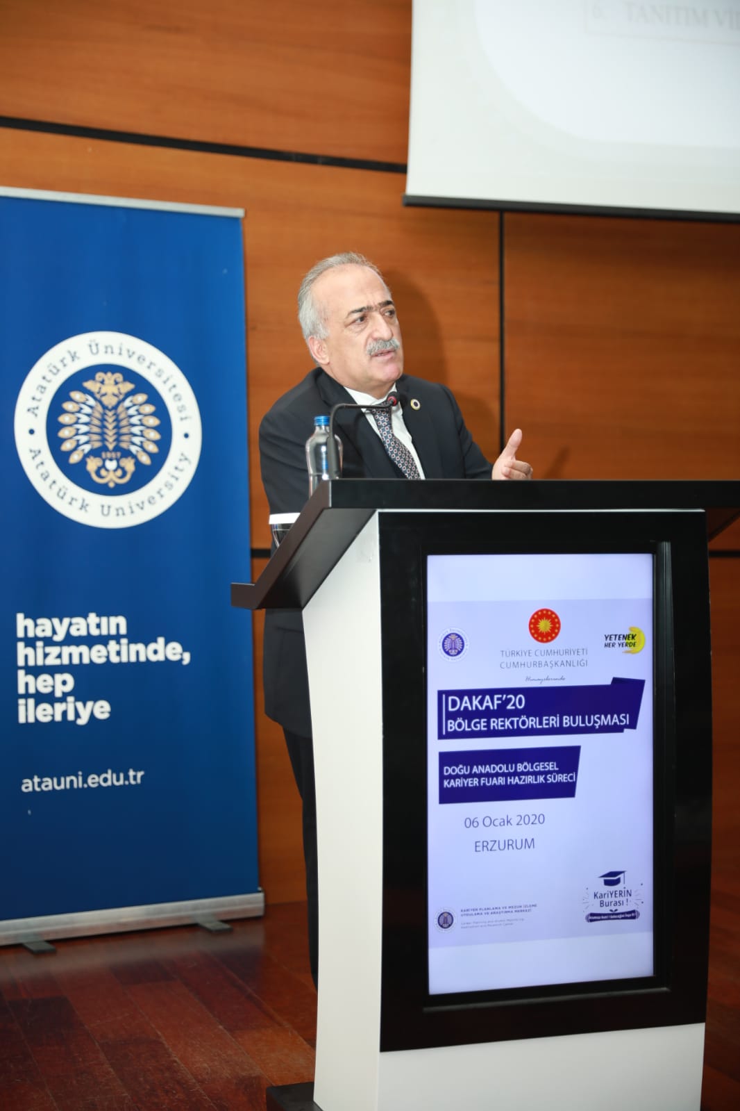 Eastern Anatolia Career Fair (DAKAF’20) preparation process and business plan evaluation meeting, which will be held on March 6-7, 2020, hosted by Atatürk University, was held in the Blue Hall of Atatürk University Cultural Center with the participation of the rectors and executives of the regional universities. Member of the Board of Higher Education Prof. Dr. Muammer Yaylalı, rector of Atatürk University Prof. Dr. Ömer Çomaklı, rector of Erzurum Technical University Prof. Dr. Bülent Çakmak, rector of Ağrı İbrahim Çeçen University Prof. Dr. Abdulhalık Karabulut, rector of Erzincan Binali Yıldırım University Prof. Dr. Akın Levent, rector of Ardahan University Prof. Dr. Mehmet Biber, rector of Artvin Çoruh University Prof. Dr. Fahrettin Tilki, rector of Kars Kafkas University. Prof. Dr. Hüsnü Kapu, rector of Munzur University Prof. Dr. Ubeyde İpek, rector of Batman University Prof. Dr. Aydın Durmuş, rector of Iğdır University Prof. Dr. Mehmet Hakkı Alma, vice rector of Van Yüzüncü Yıl University Prof. Dr. Murat Kayri, vice rector of Muş Alparslan University Prof. Dr. Yaşar Karadağ and many academicians from the universities attended the meeting.
