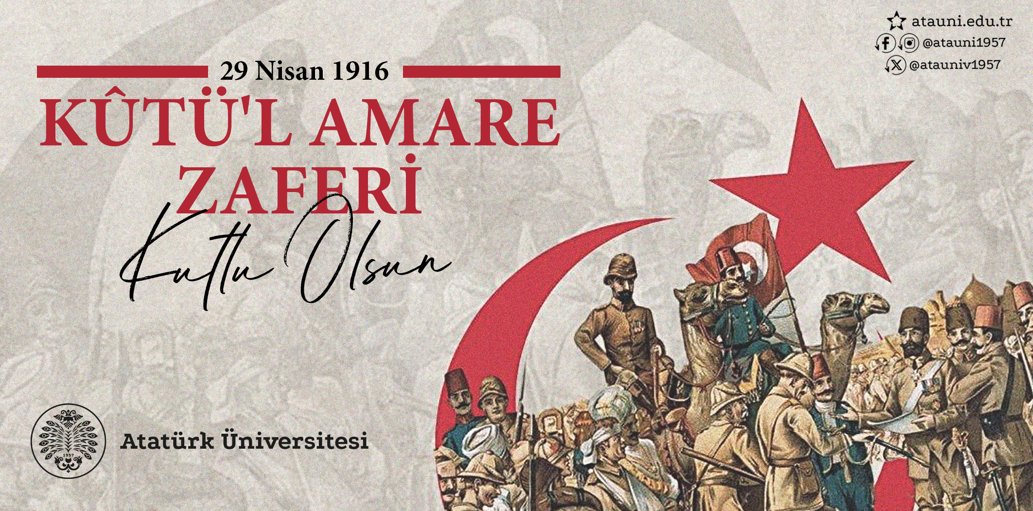 A greeting was published by Prof. Dr. Ahmet Hacımüftüoğlu, the Rector of Atatürk University, in honor of the 109th Anniversary of the Kut Al Amara Victory. The following expressions were employed by Rector Hacımüftüoğlu in his message: