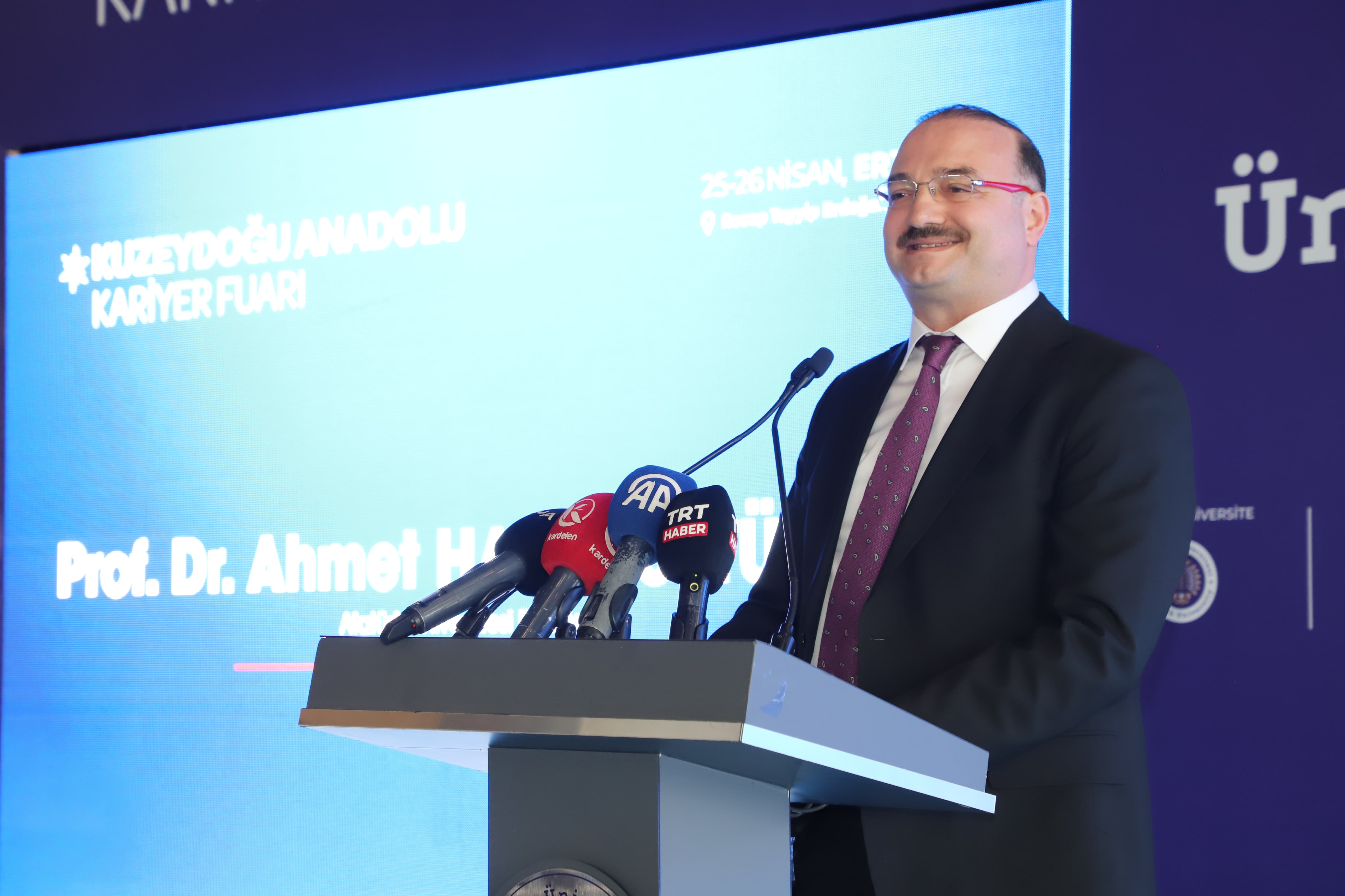 Rector Hacımüftüoğlu welcomed the audience with the following words: "I am delighted to be here at the Northeastern Anatolia Career Fair, and I extend my warmest regards to all." He explained that the universities in the region make a concerted effort to equip young people with the necessary skills in all aspects of life, in addition to academics.