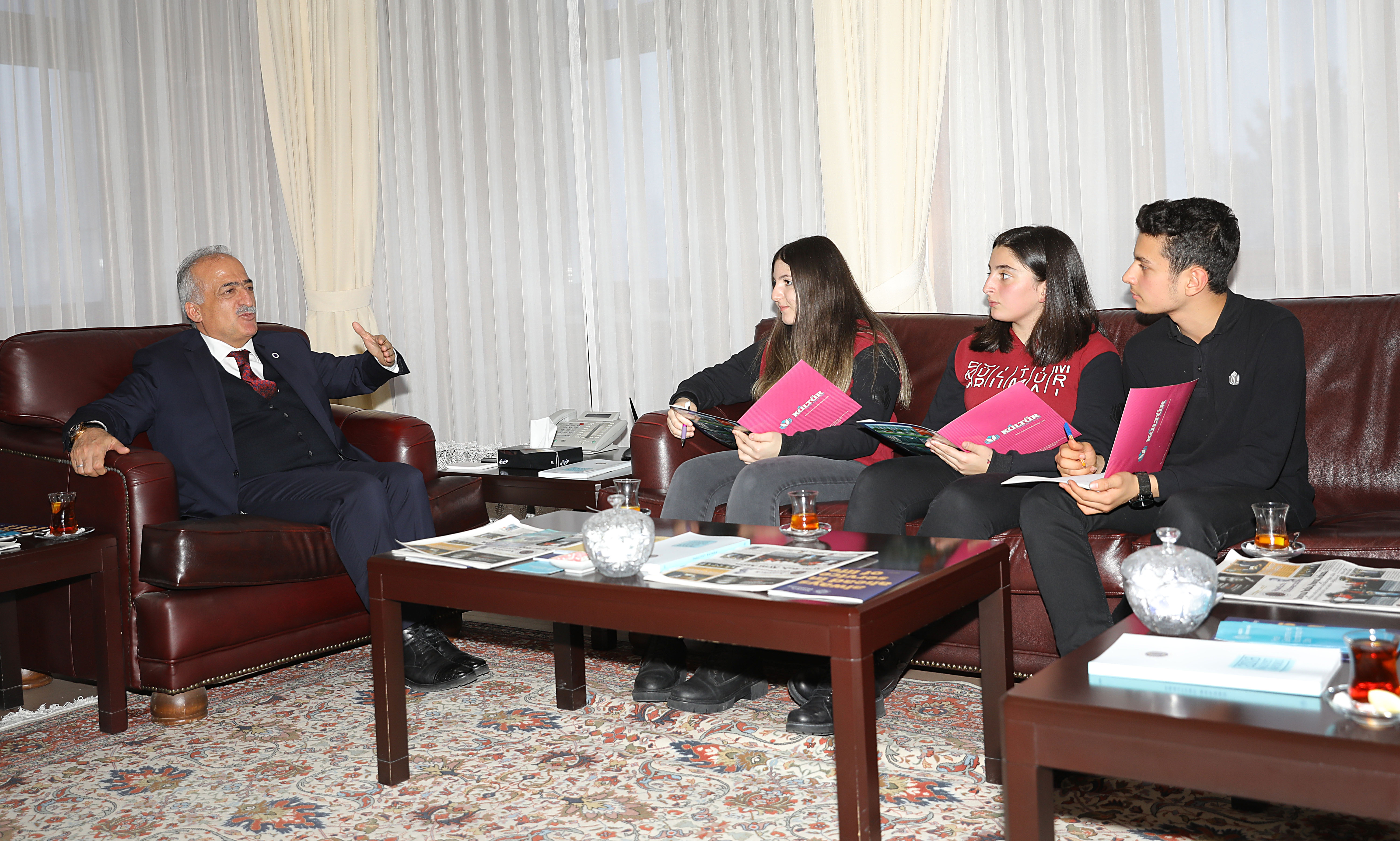 Rector of Atatürk University Prof. Dr. Ömer Comaklı received high school students in his office who came to interview him.