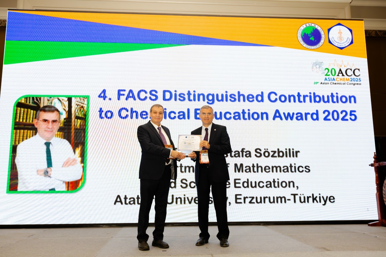 Prof. Dr. Sözbilir was awarded the 'FACS Distinguished Contribution to Chemical Education Award 2025' during the 20th Asian Chemistry Congress (ASIACHEM 2025), which took place in Bangkok, the capital of Thailand, from June 23 to June 27, 2025.