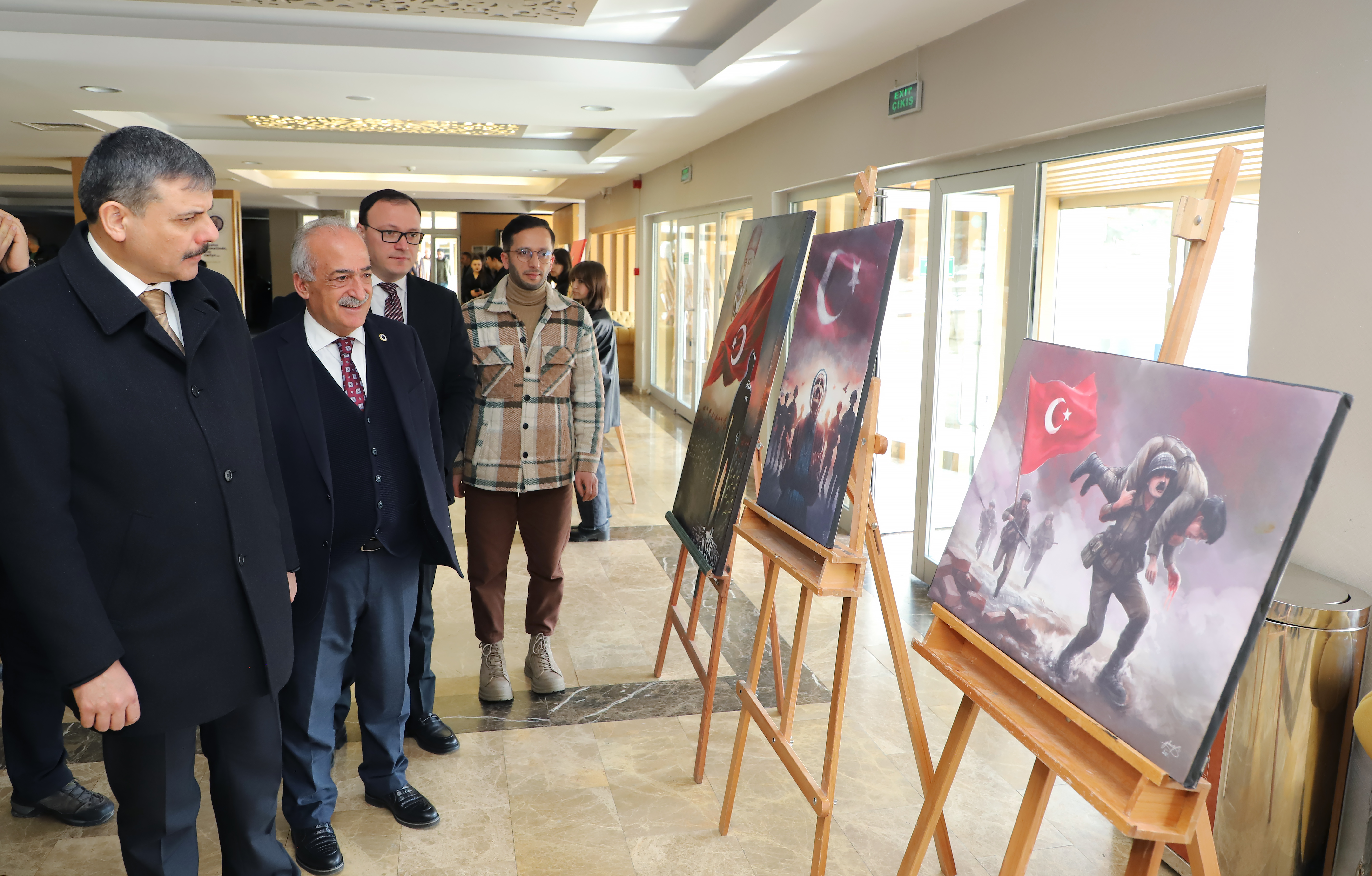 Governor Mustafa Çiftci and Rector Prof. Dr. Ömer Çomaklı stopped by the painting exhibition curated by the students of Raci Alkır Fine Arts High School prior to the commencement of the program.