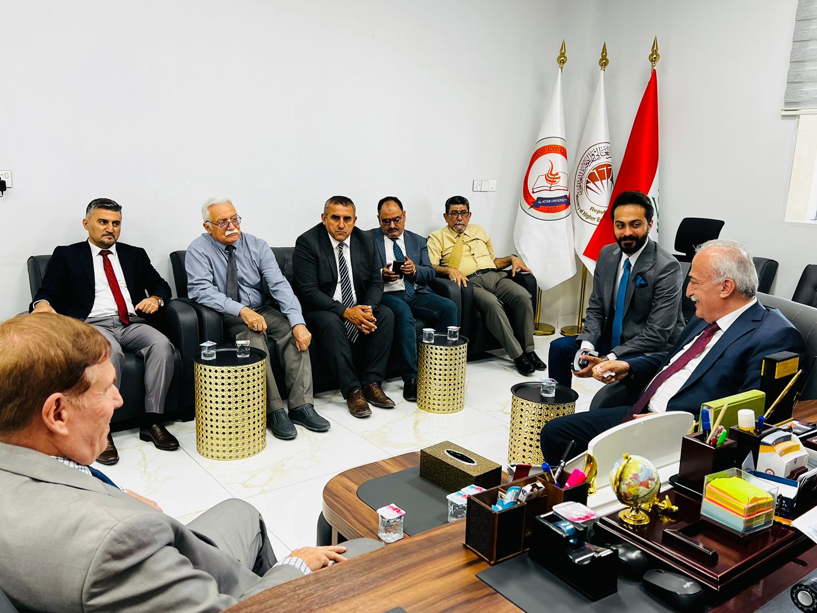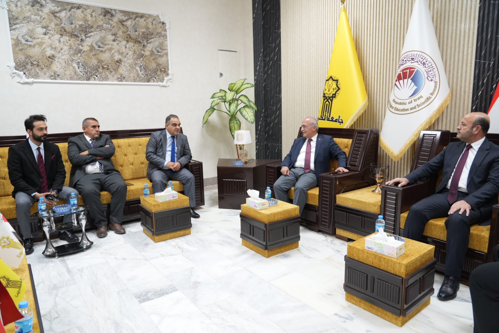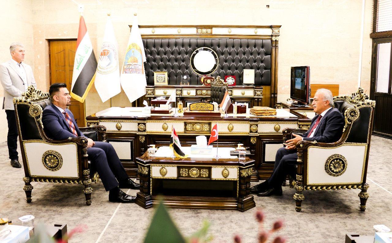 Rector Çomaklı convened a meeting with the following individuals: Anıl Bora İnan, Ambassador of the Republic of Turkey to Baghdad, Aydın Maruf, Iraqi Minister Responsible for Ethnic and Religious Formations and Member of the Executive Board of the Iraqi Turkmen Front (ITC), Heytem Haşim Muhtaroğlu, 1st Vice President of the Iraqi Turkmen Front (ITC), Hişam Bayraktar, Vice President, Dr. Murat Saib, President of the Union of Iraqi Turkmen Academics, and Murat İmadeddin Türkmen, President of the Turkmeneli Students and Youth Union.