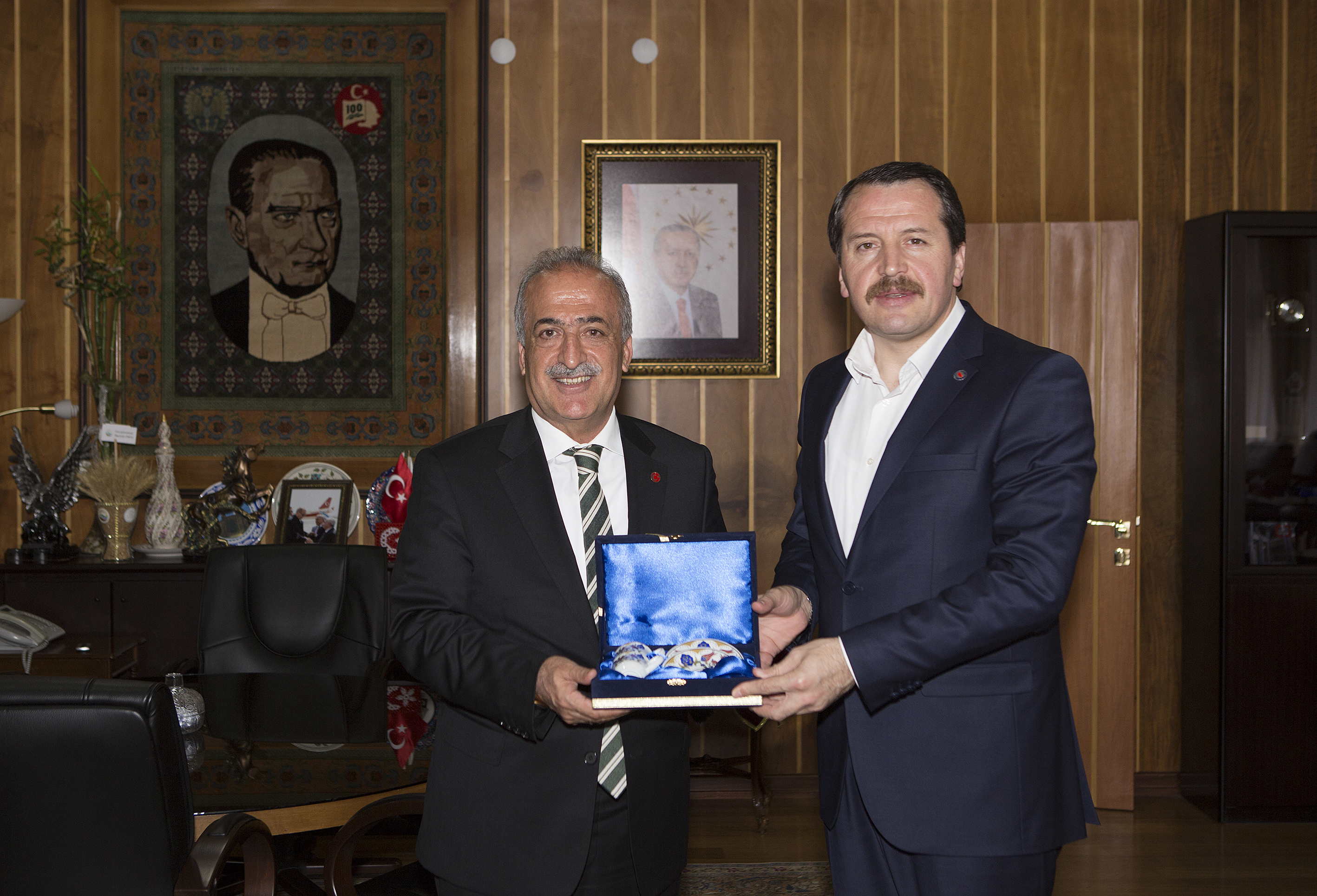 The chairman of Memur-Sen Confederation and Eğitim-Bir-Sen, Ali Yalçın came to Erzurum for the award ceremony of " Bir Bilenle Bilge Nesil" Project and visited Rector Prof.Dr. Çomaklı in his office. After the visit Rector Çomaklı and the deans in company with him inaugurated "Library Yedi Güzel Adam" which has come into service in Kazım Karabekir Dormitory Directorship, accepting the kind invitation of Memur-Sen Chairman Ali Yalçın.