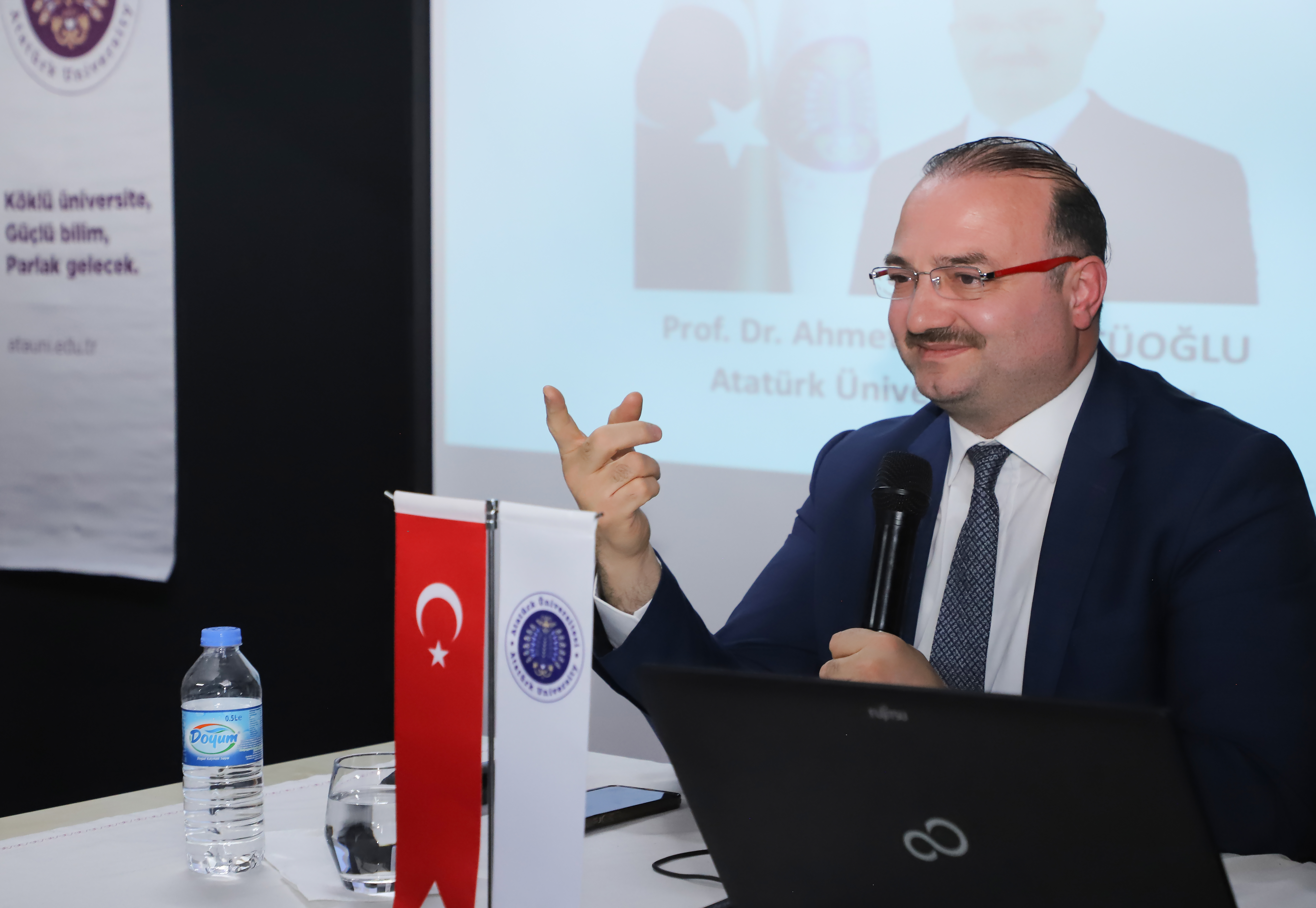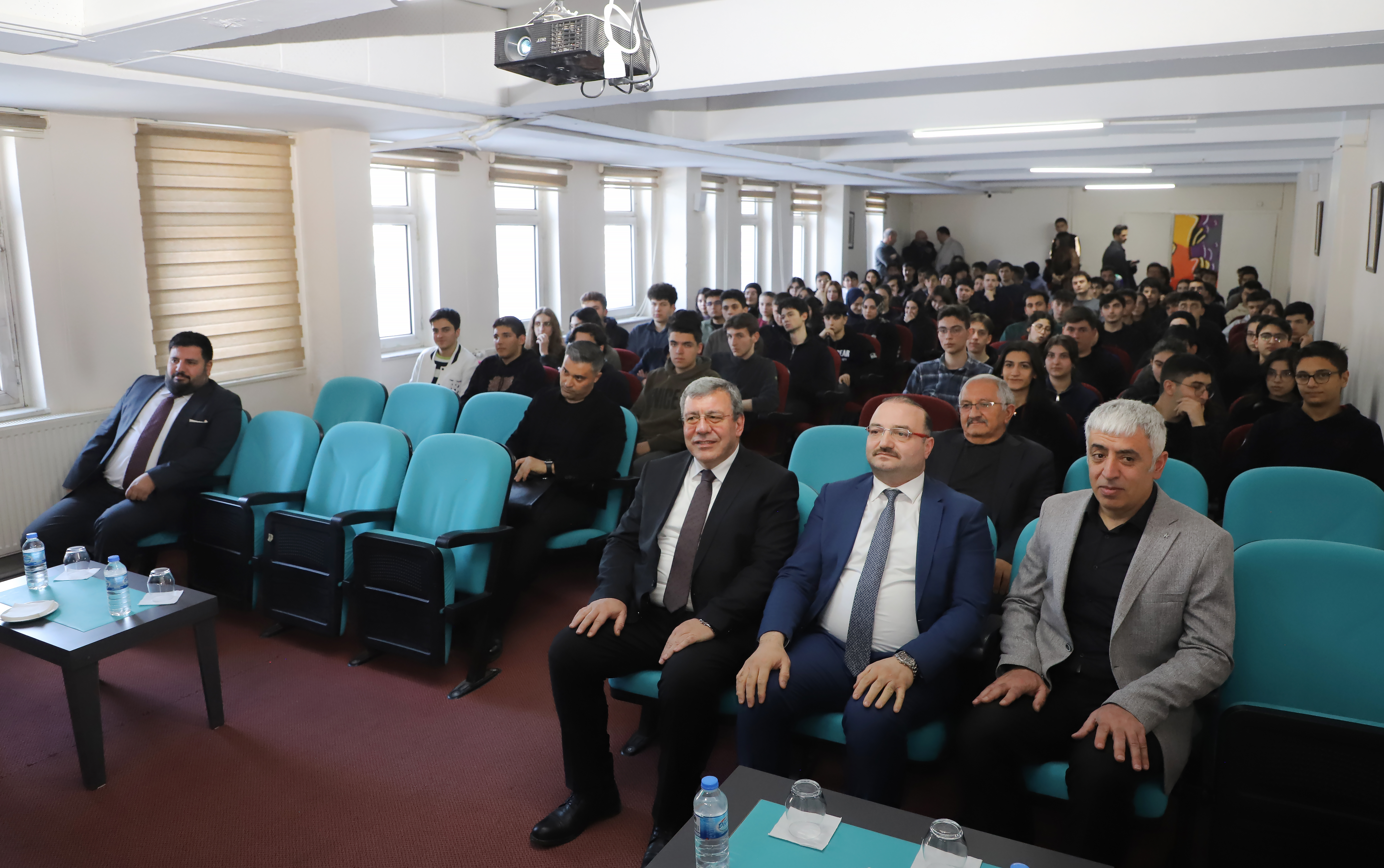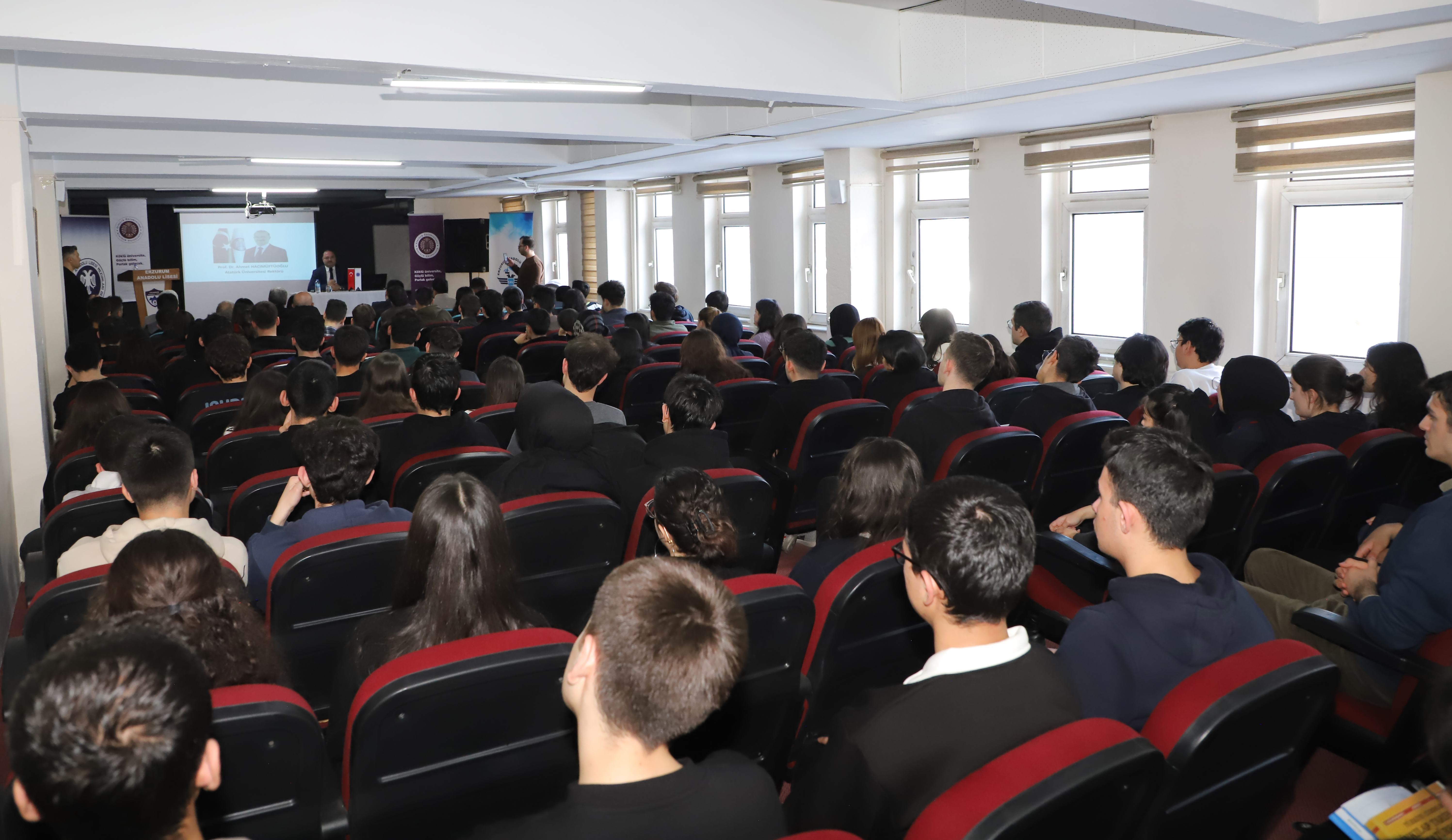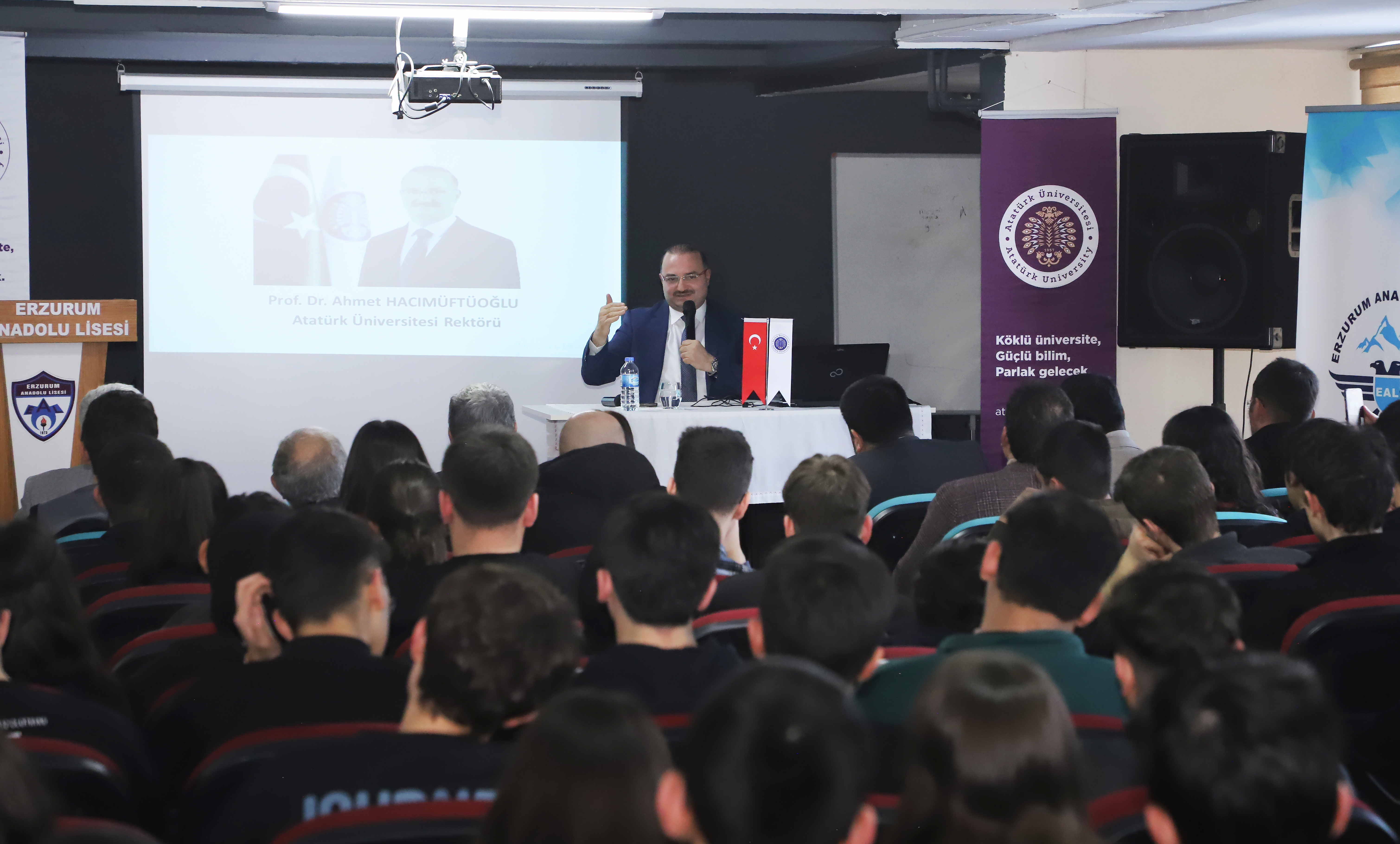 Prof. Dr. Ahmet Hacımüftüoğlu, the Rector of Atatürk University, was a guest at the Career Talk program, which was organized by the Erzurum Central Anatolian High School and the Erzurum Central Anatolian High School Alumni Association. Rector Hacımüftüoğlu shared his career journey with students at the school where he previously studied.