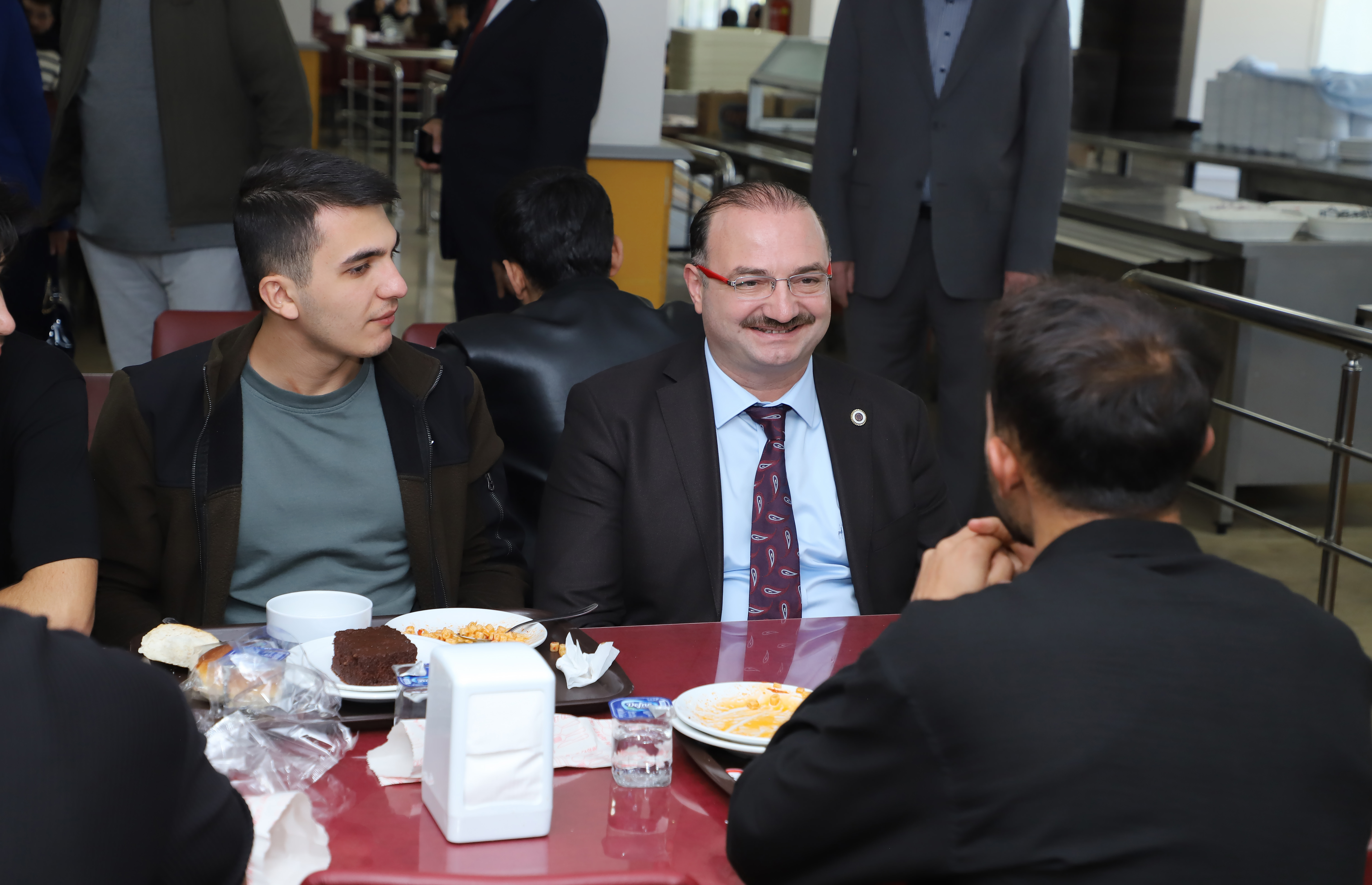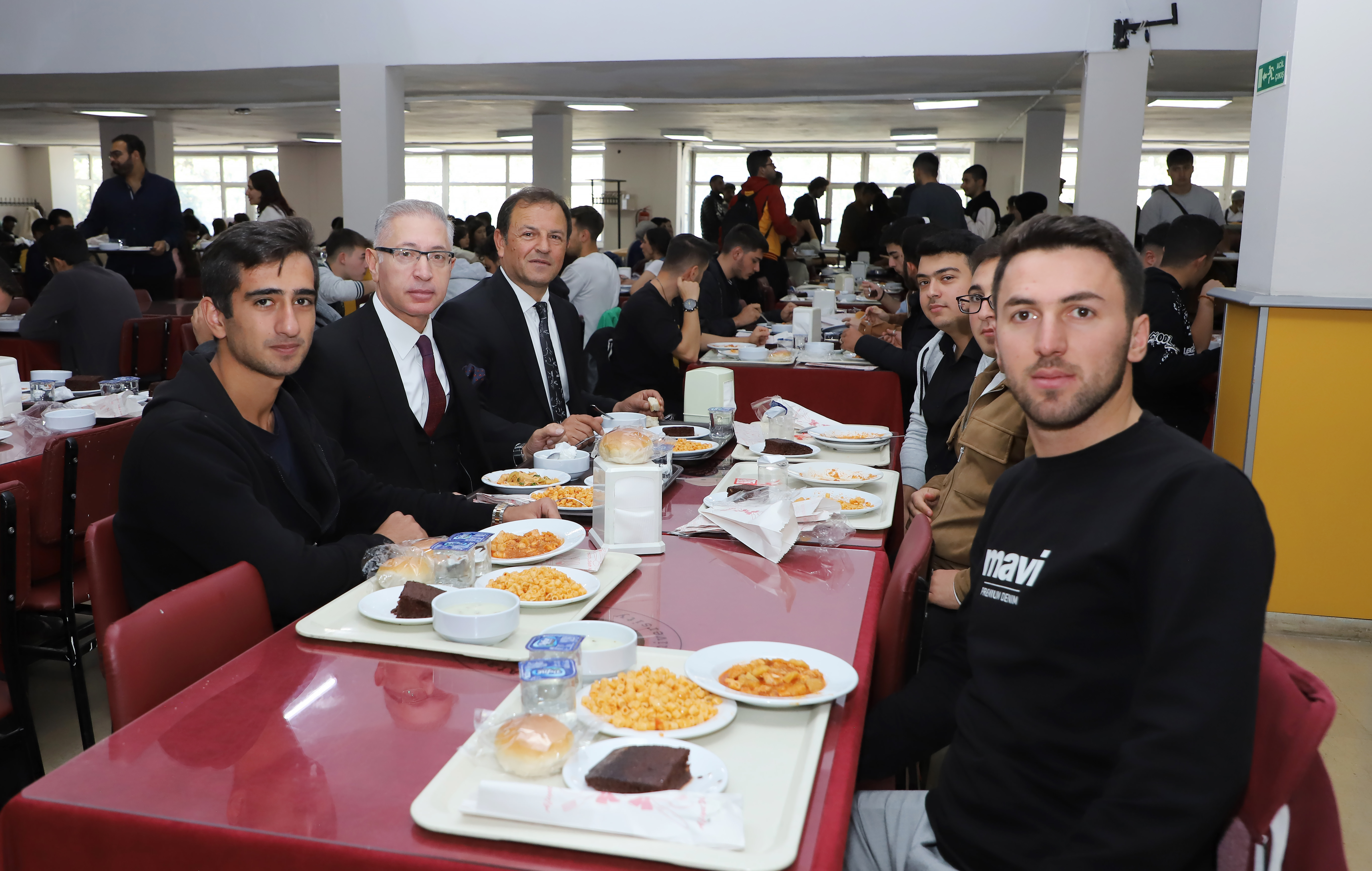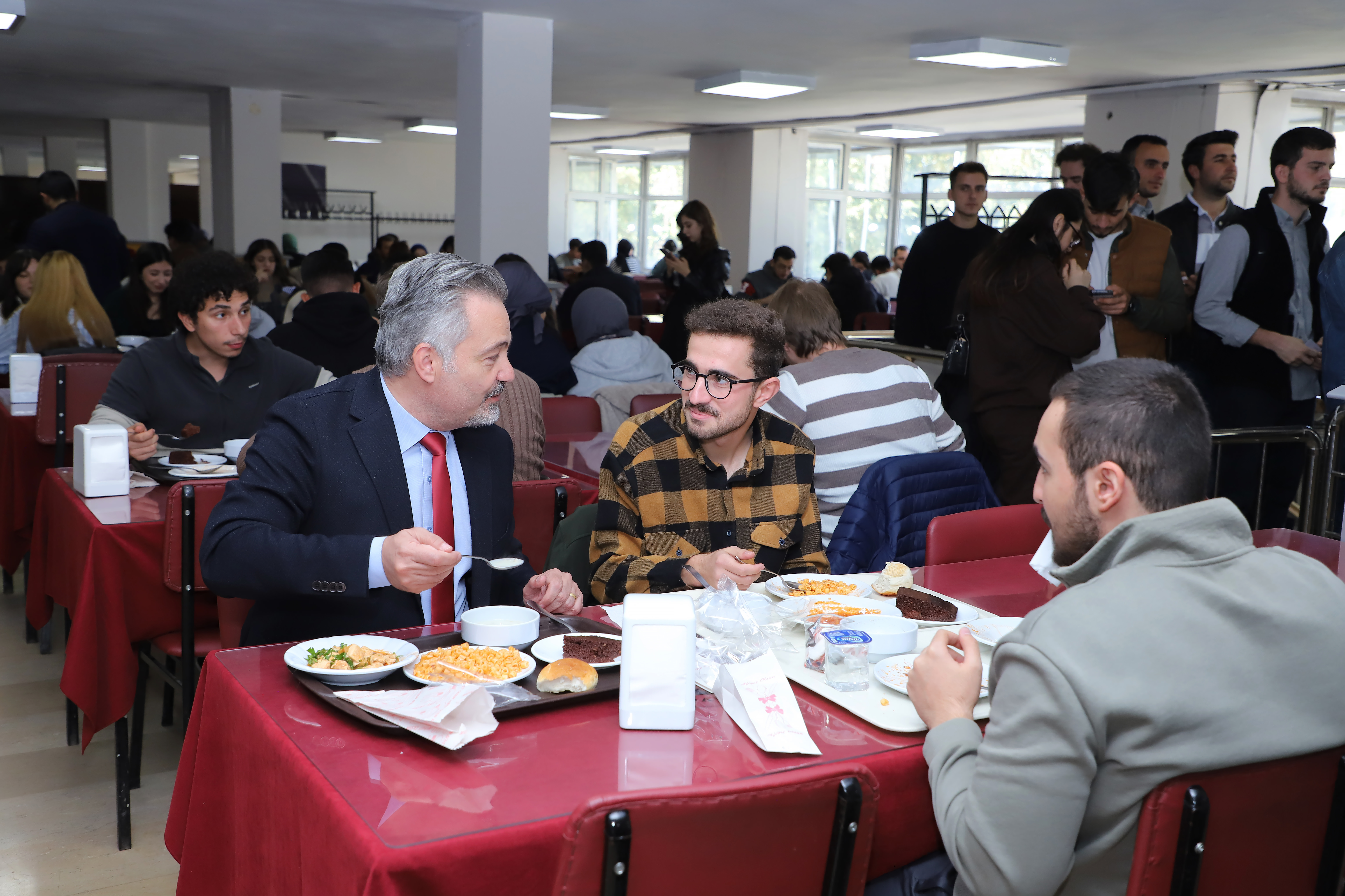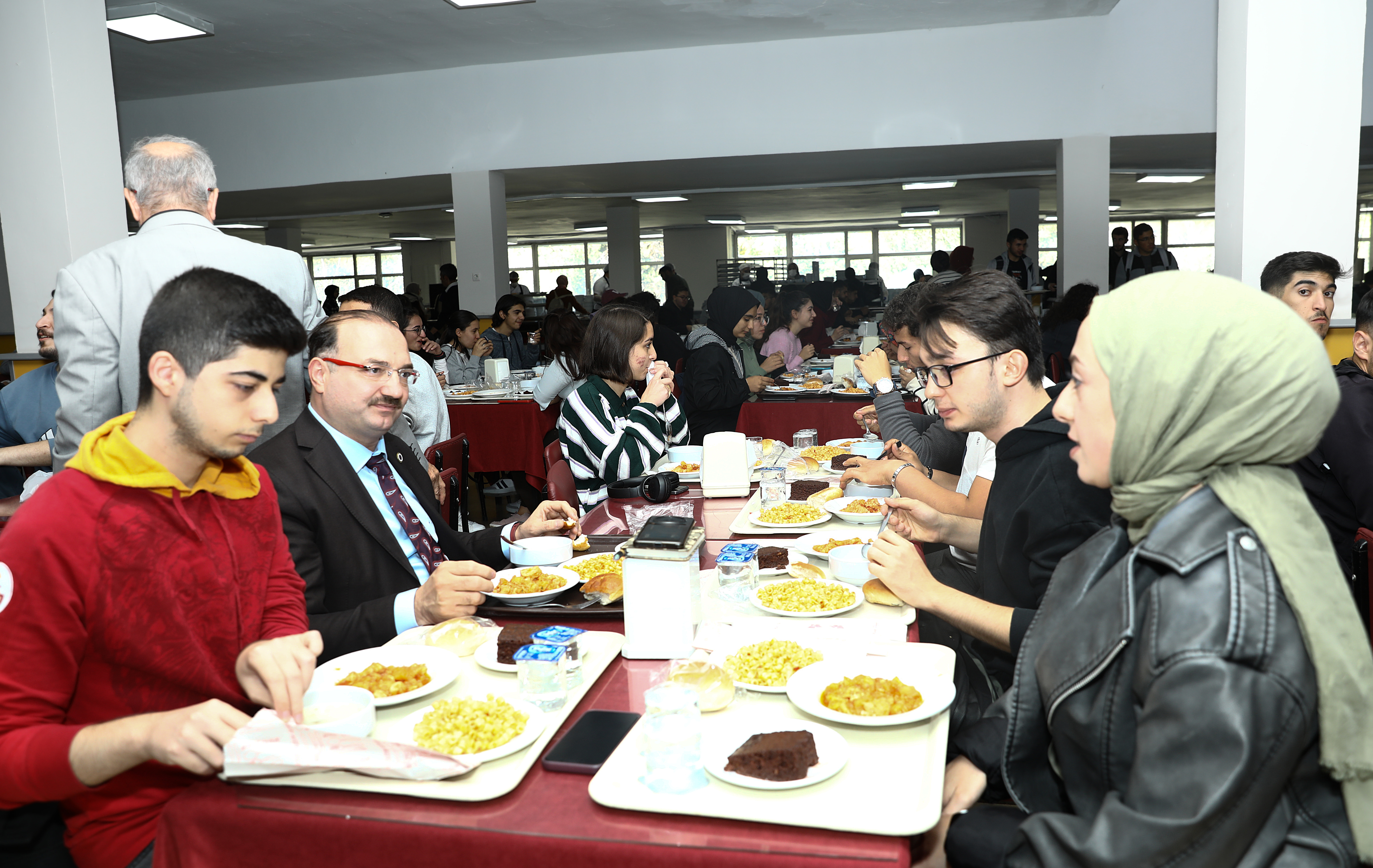 Vice rectors and advisors to the rector accompanied Rector Hacımüftüoğlu as he visited the central cafeteria and had lunch with students. Hacımüftüoğlu, who queued up with students and was served his supper at the cafeteria, which serves approximately 10,000 students daily, conversed with the students at their tables.