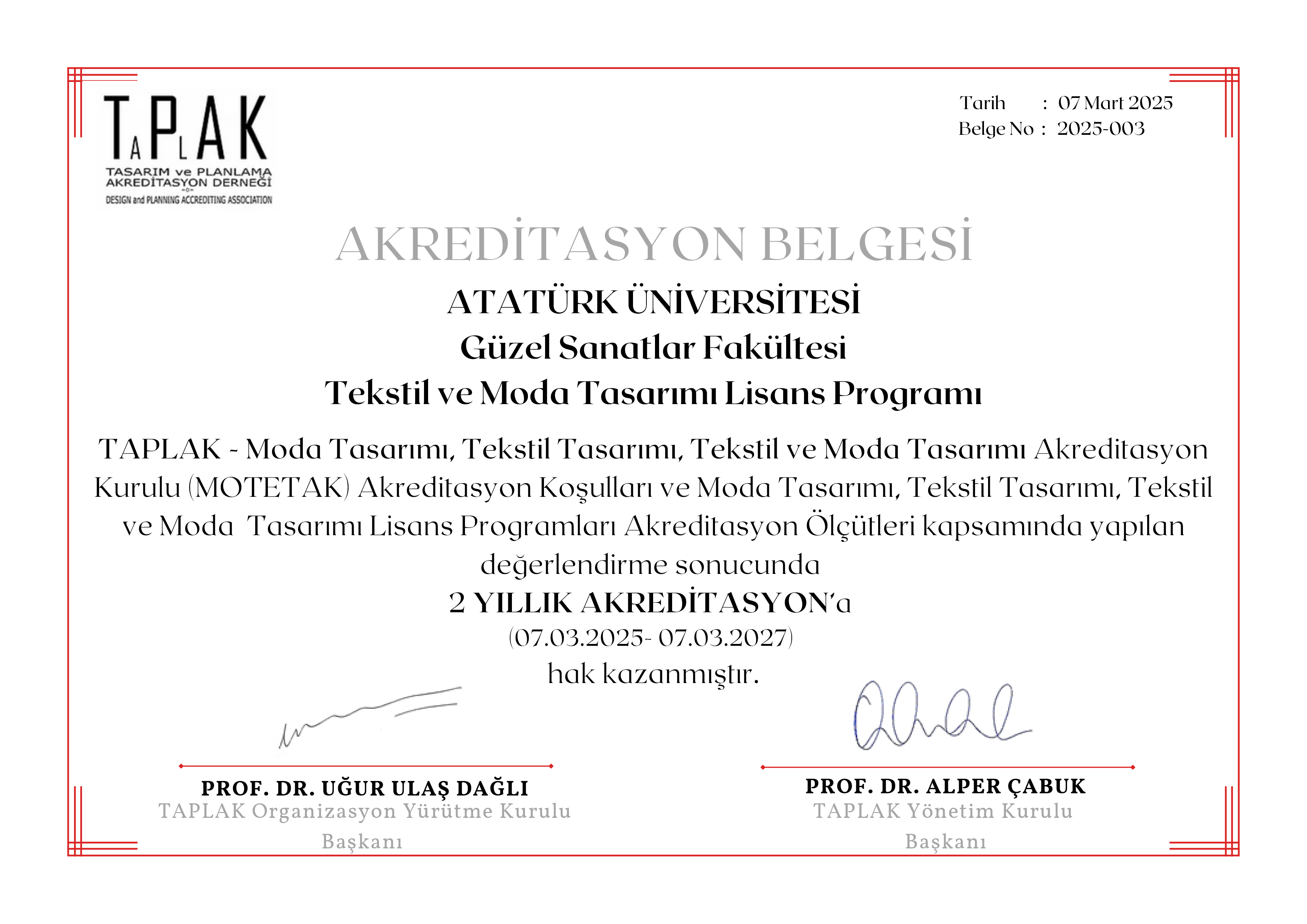 Prof. Dr. Bünyamin Aydemir, Dean of the Faculty of Fine Arts, announced that the institution has been granted a two-year accreditation period that will be effective from March 7, 2025, to March 7, 2027, as a consequence of the assessment conducted by TAPLAK - Fashion Design, Textile Design, Textile and Fashion Design Accreditation Board (MOTETAK). Dean Aydemir expressed his gratitude to the TAPLAK delegation, TAPLAK Board Chairman Prof. Dr. Alper Çabuk, and Rector Prof. Dr. Ahmet Hacımüftüoğlu for their contributions.