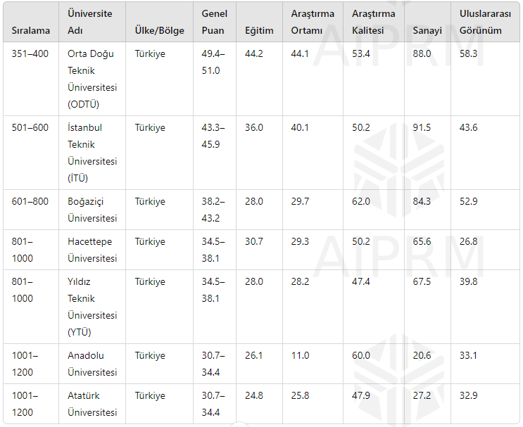 In order to present the 2025 World University Rankings to the public, higher education institutions are assessed based on five fundamental academic criteria: education-training, research environment, research quality, industry collaboration, and international outlook. These rankings, which are compiled by evaluating the performance of universities, are regarded as one of the most comprehensive analyses that are consulted by students, academics, the business world, and governments worldwide.