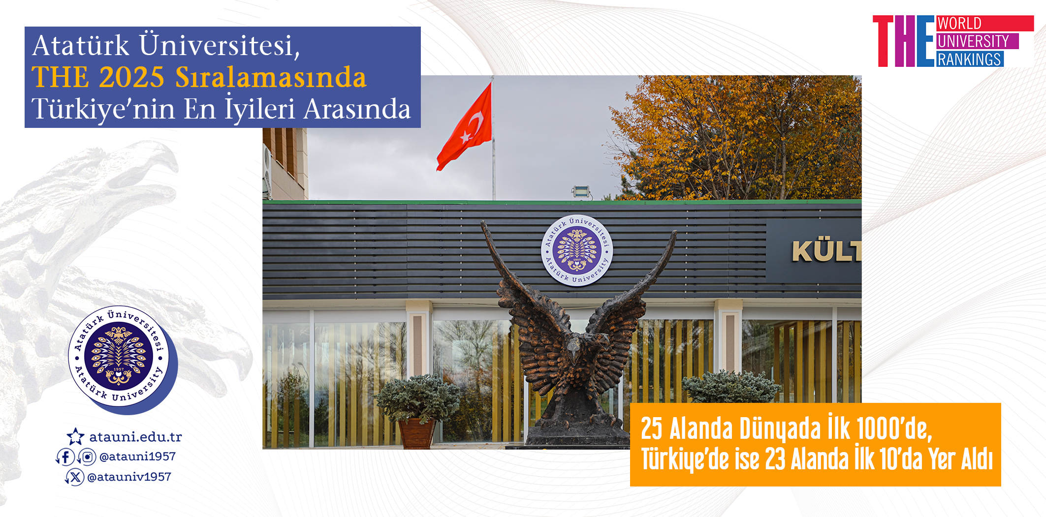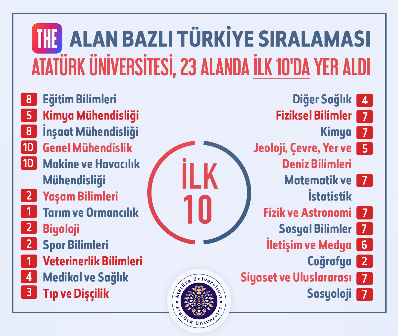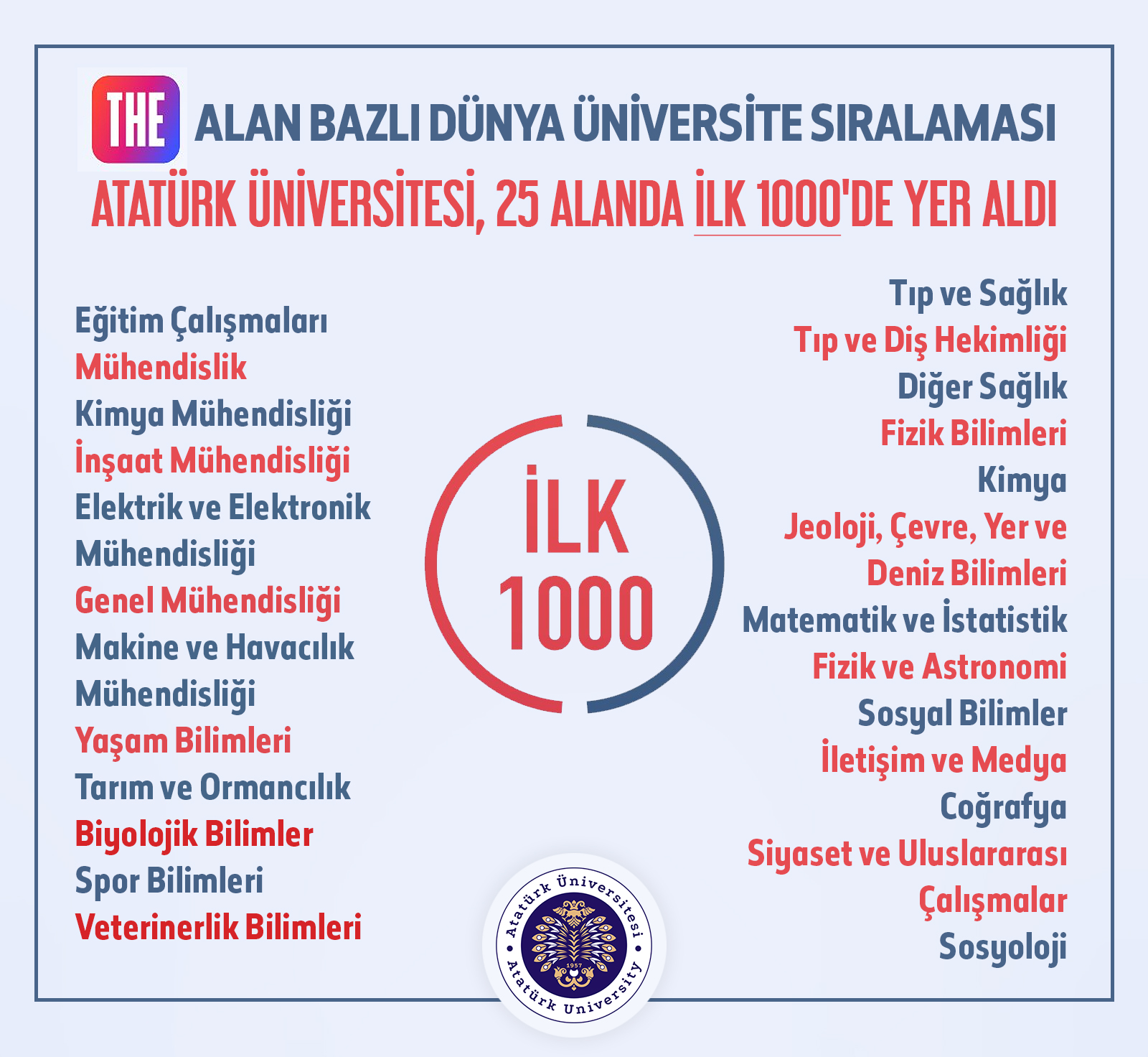 Among the World's Top 1000 Universities in 25 Fields... Atatürk University in the THE rankings; Education (501–600), Engineering (601–800), Chemical Engineering (601–800), Civil Engineering (601–800), Electrical and Electronic Engineering (601–800), General Engineering (601–800), Mechanical and Aerospace Engineering (601–800), Life Sciences (501–600), Agriculture and Forestry (501–600), Biological Sciences (501–600), Sports Sciences (501–600), Veterinary Sciences (501–600), Medicine and Health (601–800), Medicine and Dentistry (601–800), Other Health (601–800), Physical Sciences (601–800), Chemistry (601–800), Geology, Environmental, Earth and Marine Sciences (601–800), Mathematics and Statistics (601–800), Physics and Astronomy (601–800), Social Sciences (601–800), Communication and Media Studies (601–800), Geography (601–800), Politics and International Studies (601–800), Sociology (601–800) attracted attention with its success in the fields.