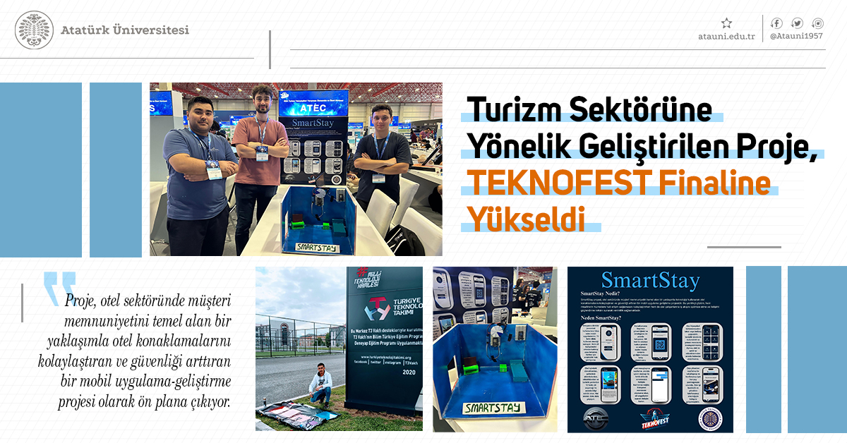 "We are very proud of the success of the ATEC team affiliated to the High Technology Community operating within the Faculty of Engineering of Atatürk University in the TEKNOFEST 2024 Tourism Technologies Category. Rector Prof. Dr. Ahmet Hacımüftüoğlu stated that Atatürk University, which aims for success in every platform it takes place, is ready to provide all kinds of support as the management in order to walk confidently and boldly towards these goals, congratulated the students for this success and used the following statements: "We are very proud of the success of the ATEC team affiliated to We are sure that our team, which effectively combined creative ideas presented by technology in the travel industry with their project dubbed SmartStay, will show our institution in the best possible light in the finals to be conducted in Antalya. This significant achievement reflects the will, talent, and creative thinking ability of our students. I really wish them continuous success and truly congratulate them.