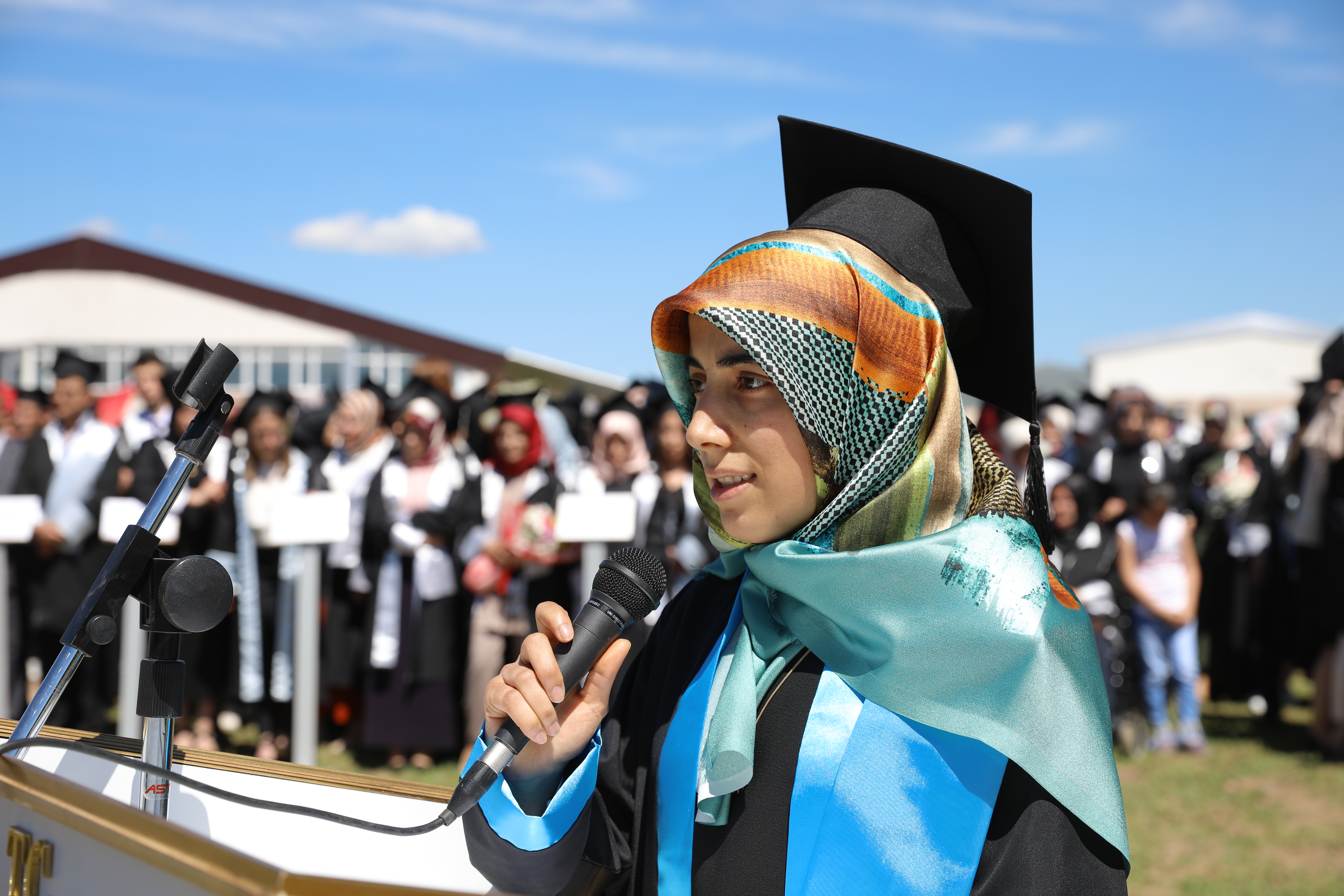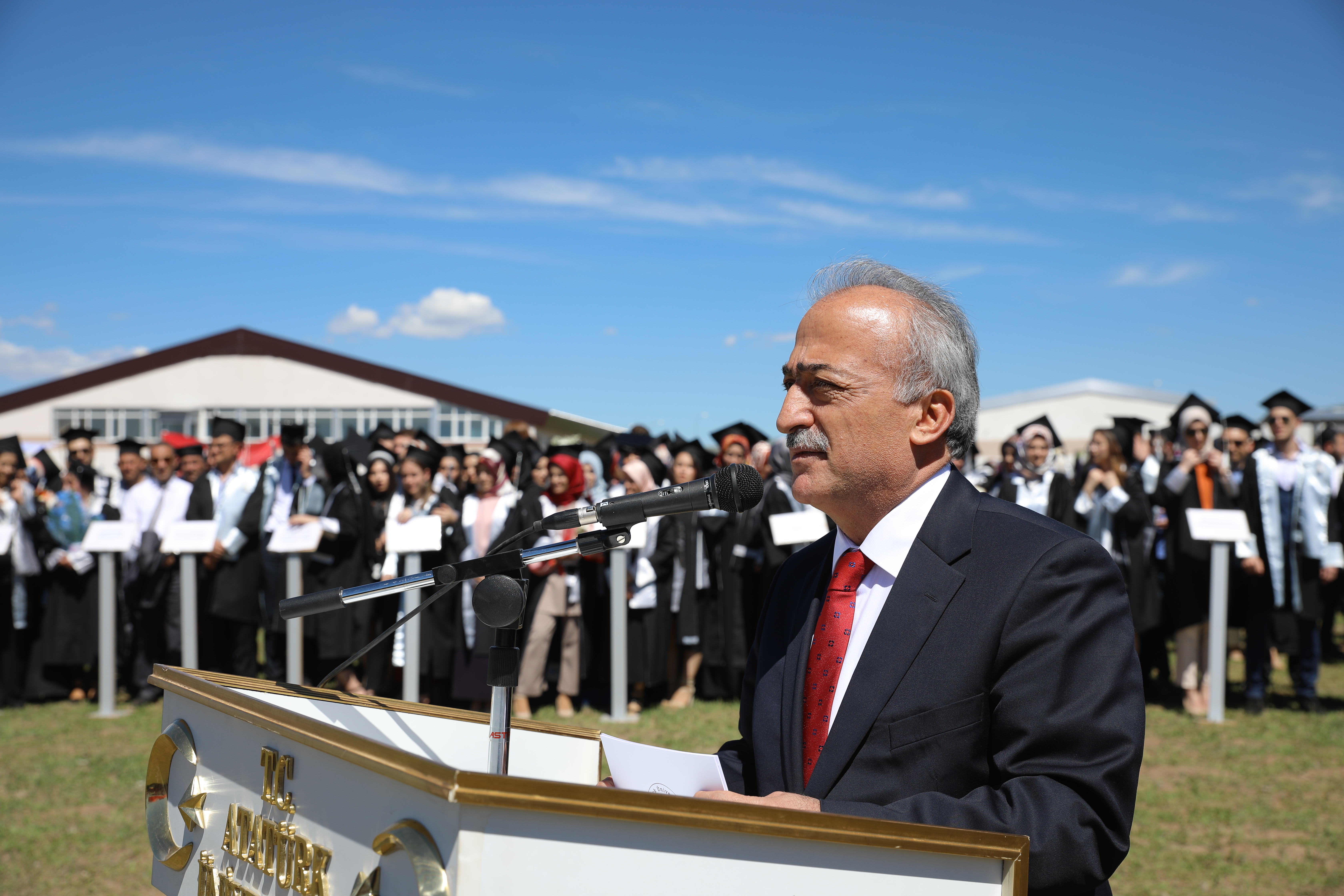 Cennet vatanımızın ve içinde bulunduğu bölgenin yaşadığı zor günlerin son bulması ve Türkiye'nin bölünmez bütünlüğünün daim olması dileklerimle Malazgirt Savaşından itibaren vatan toprakları ve tüm değerlerimiz uğruna şehit olan tüm vatan evlâdını, bu bağlamda sevgili Peygamberimizin kucağına uğurlanan gencecik şehitlerimizi rahmetle anıyor, mezuniyetinizin hayırlı olmasını diliyorum” dedi.