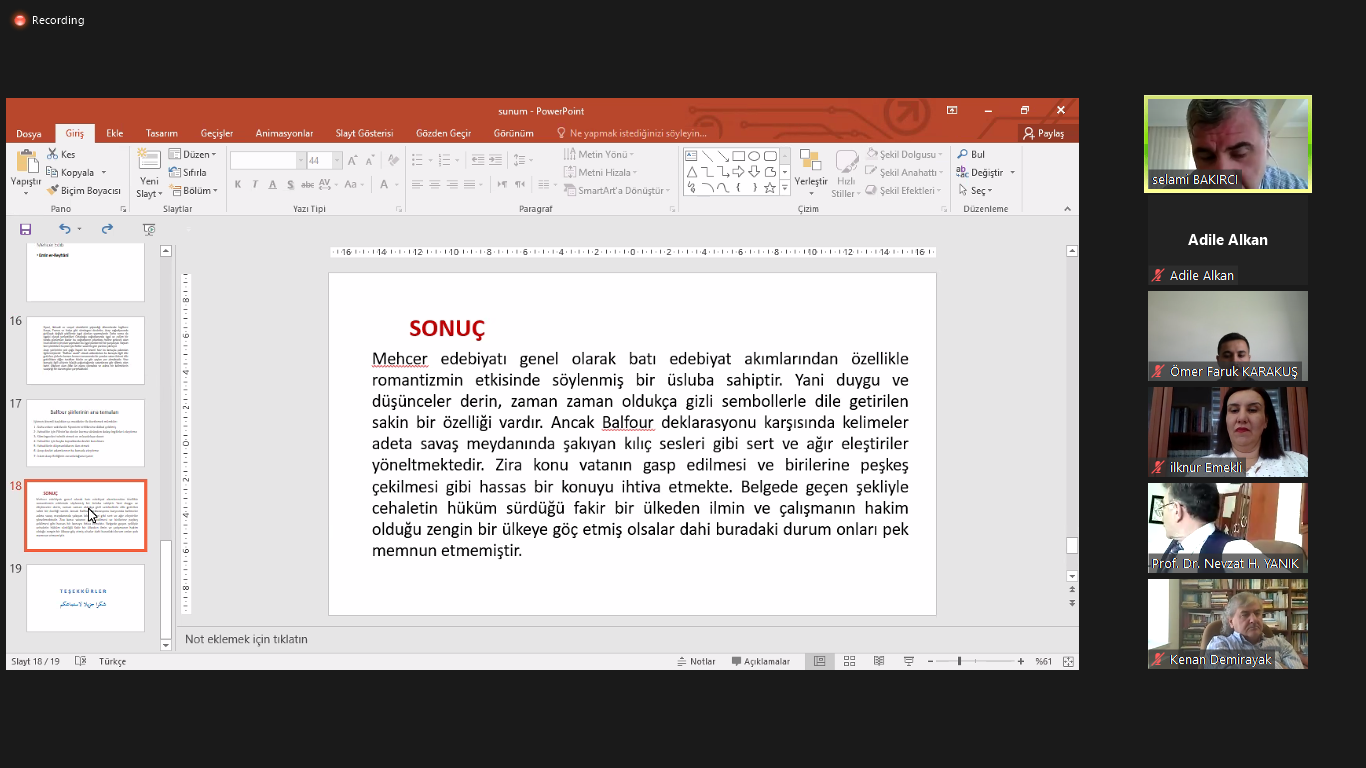 Katılımcılardan Prof. Dr. Selami Bakırcı, “Balfour Deklarasyonun Mehcer Edebiyatına Yansıması” konulu sempozyumun ilk sunumunu gerçekleştirdi. Sunum kapsamında politikacı Arthur Balfour’dan bahsedildiği gibi göç, göç sebebi ve göç sebebiyle doğan dışlanma korkusu da ele alındı.