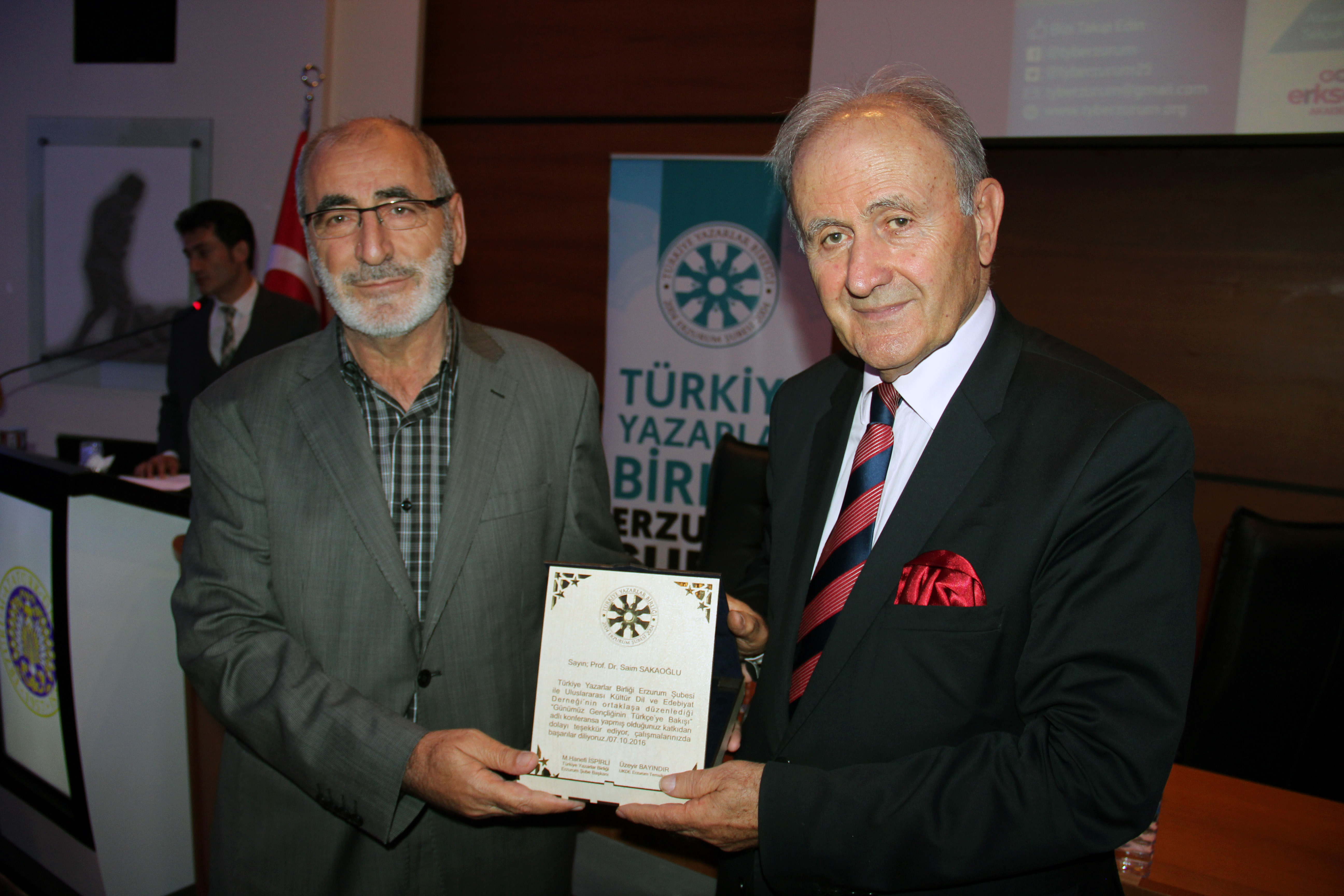 Konferansın sonunda ise Atatürk Üniversitesi Rektör Yardımcısı Prof. Dr. Nihat Yatkın, Prof. Dr. Saim Sakaoğlu'na plaket takdim etti.
