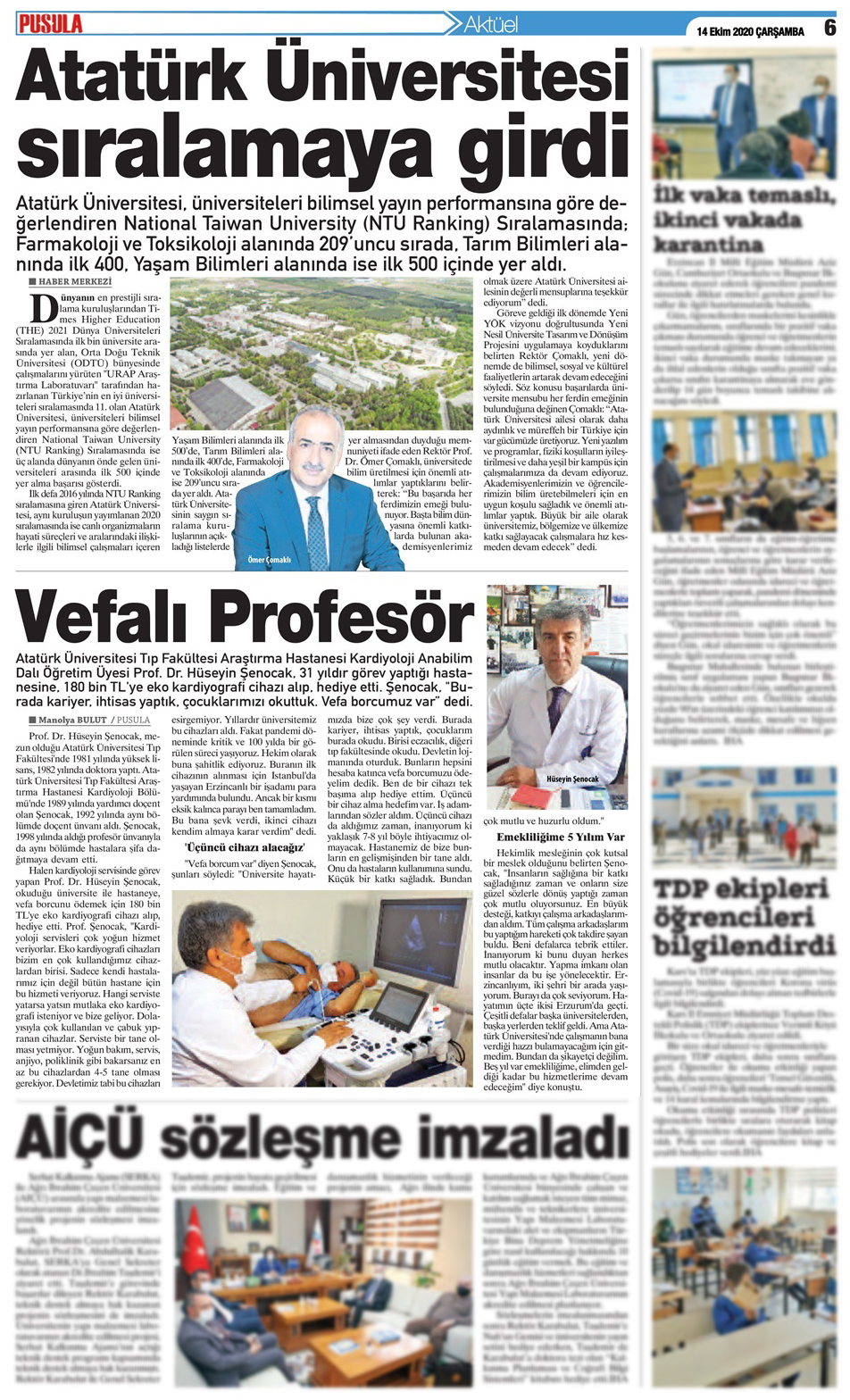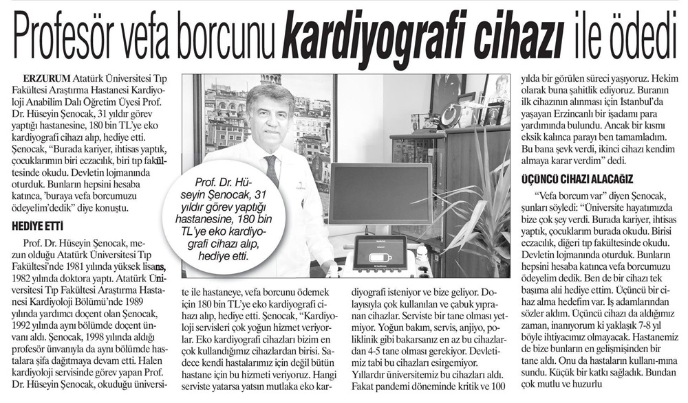 Erzurum Atatürk Üniversitesi Tıp Fakültesi Araştırma Hastanesi Kardiyo­loji Anabilim Dalı öğretim Üyesi Prof. Dr. Hüseyin Şenocak, 31 yıldır görev yaptığı hastanesine 180 Bin TL’ye eko kardiyografi cihazı alıp, hediye etti.