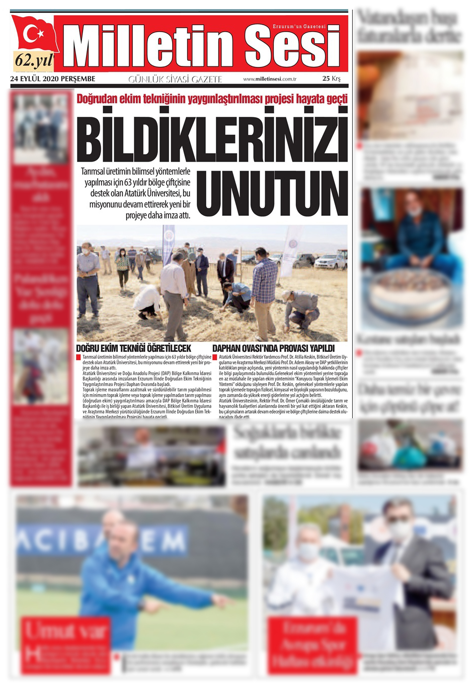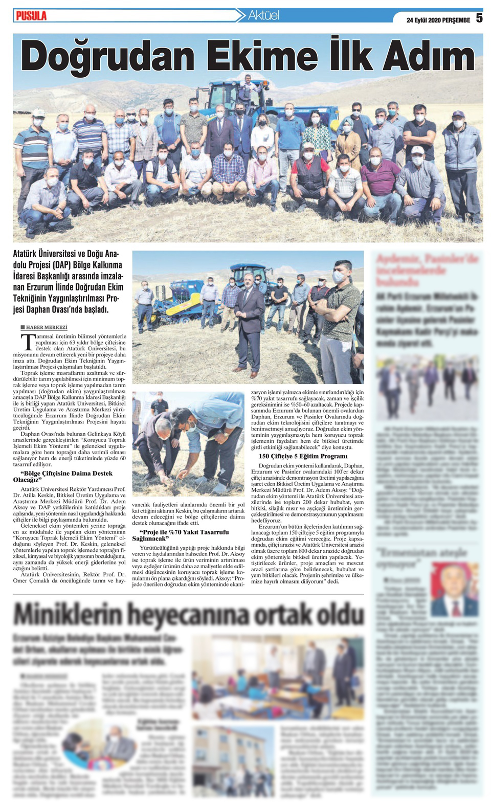 Atatürk Üniversitesi ve Doğu Anadolu Projesi (DAP) Bölge Kalkınma İdaresi Başkanlığı arasında imzalanan Erzurum İlinde Doğrudan Ekim Tekniğinin Yaygınlaştırılması Projesi Daphan Ovasında başladı.