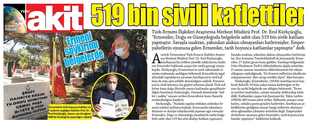 Türk-Ermeni İlişkileri Araştırma Merkezi Müdürü Prof. Dr. Erol Kürkçüoğlu, “Ermeniler, Doğu ve Güneydoğuda belgelerle sabit olan 519 bin sivile katliam yapmıştır. Savaşla uzaktan, yakından alakası olmayanları katletmişler. Emperyalistlerin oyununa gelen Ermeniler, tarih boyunca katliamlar yapmıştır" dedi.
