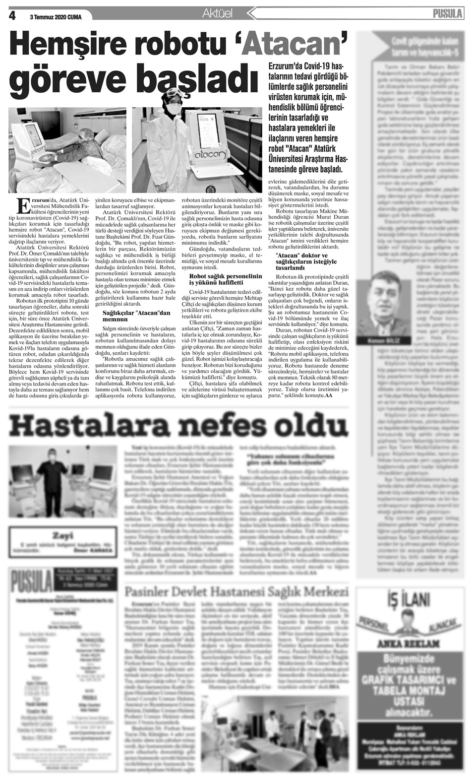 Erzurum'da Covid-19 hastalarının tedavi gördüğü bölümlerde sağlık personelini virüsten korumak için, mühendislik bölümü öğrencilerinin tasarladığı ve hastalara yemekleri ile ilaçlarını veren hemşire robot 'Atacak' Atatürk Üniversitesi Araştırma Hastanesinde göreve başladı.