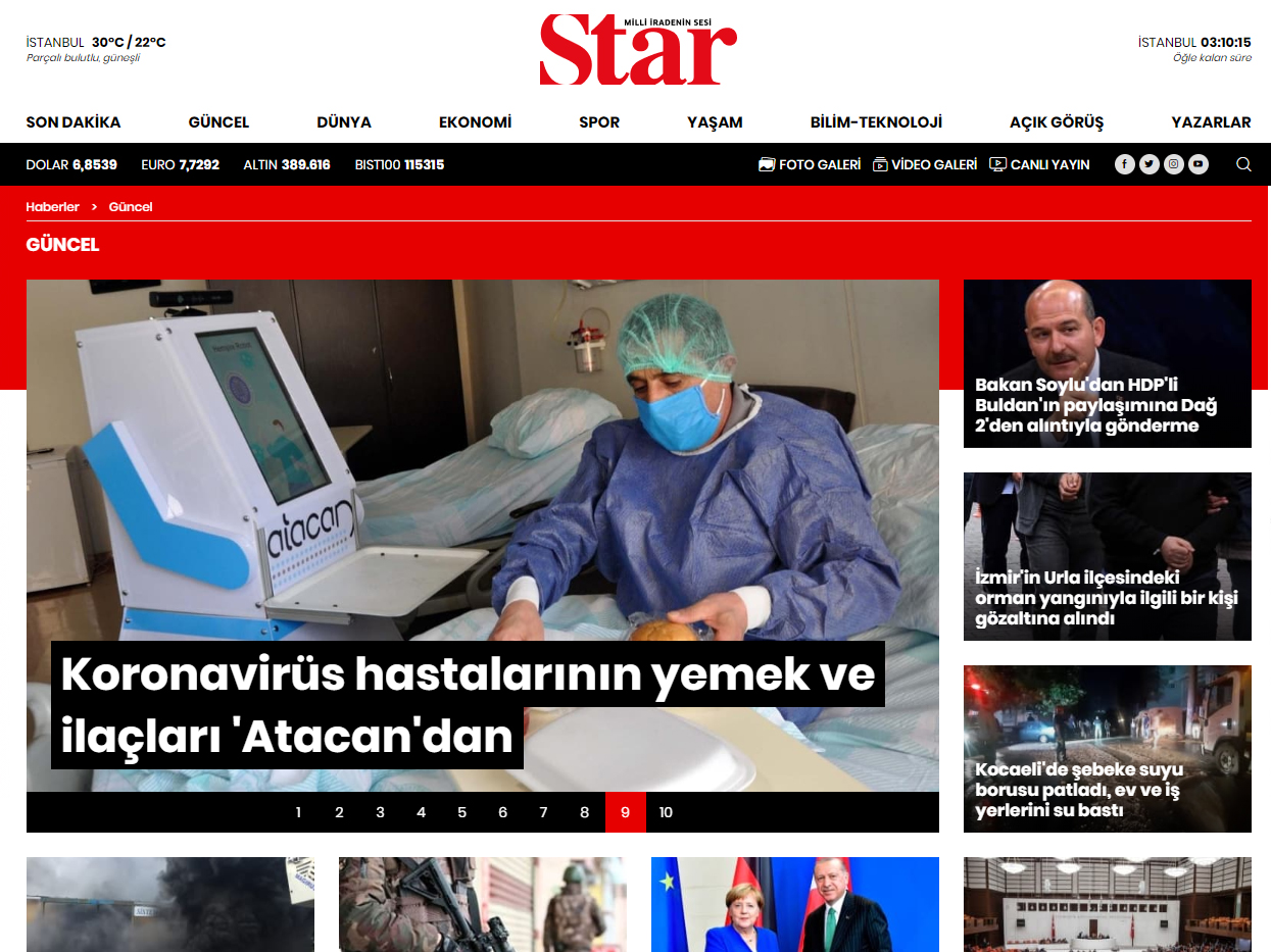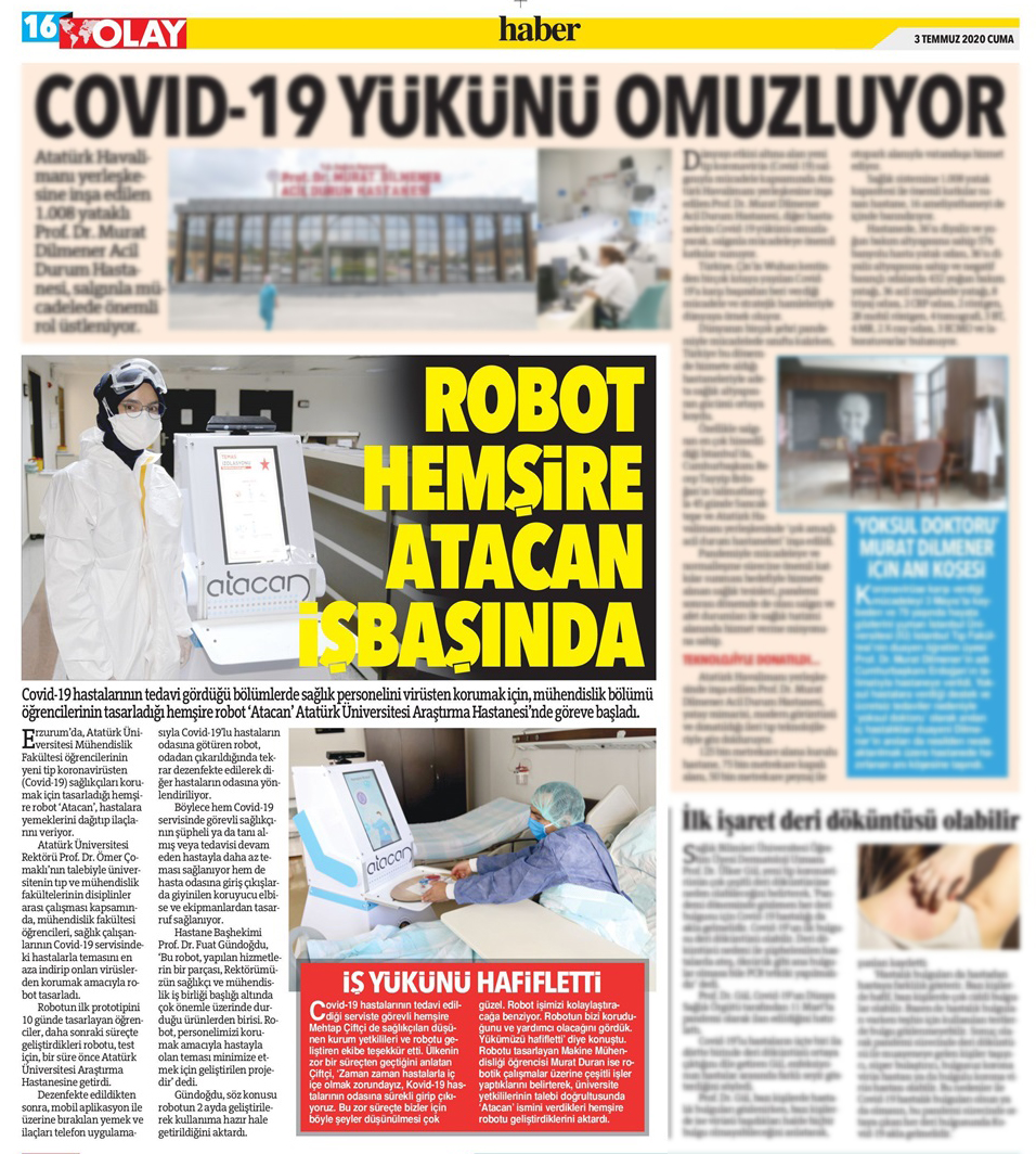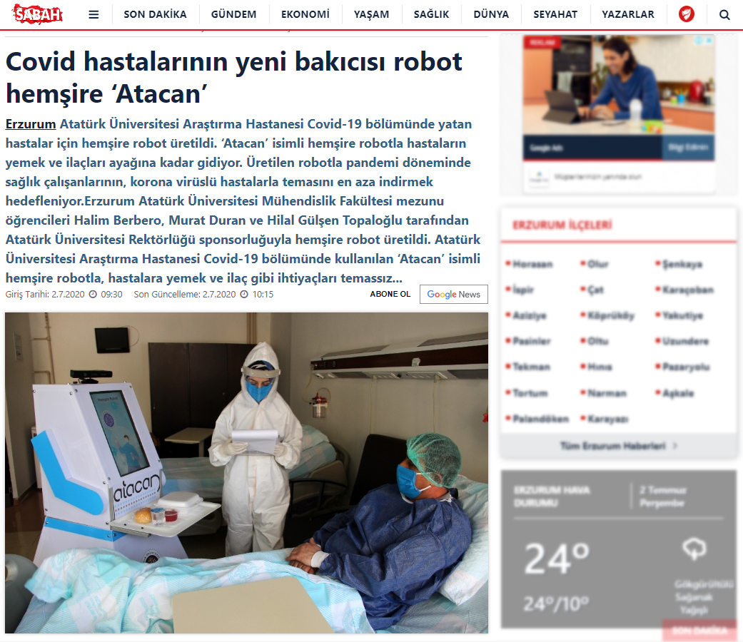 Atatürk Üniversitesi Araştırma Hastanesi Covid-19 bölümünde yatan hastalar için hemşire robot üretildi. ‘Atacan’ isimli hemşire robotla hastaların yemek ve ilaçları ayağına kadar gidiyor. Üretilen robotla pandemi döneminde sağlık çalışanlarının, korona virüslü hastalarla temasını en aza indirmek hedefleniyor.