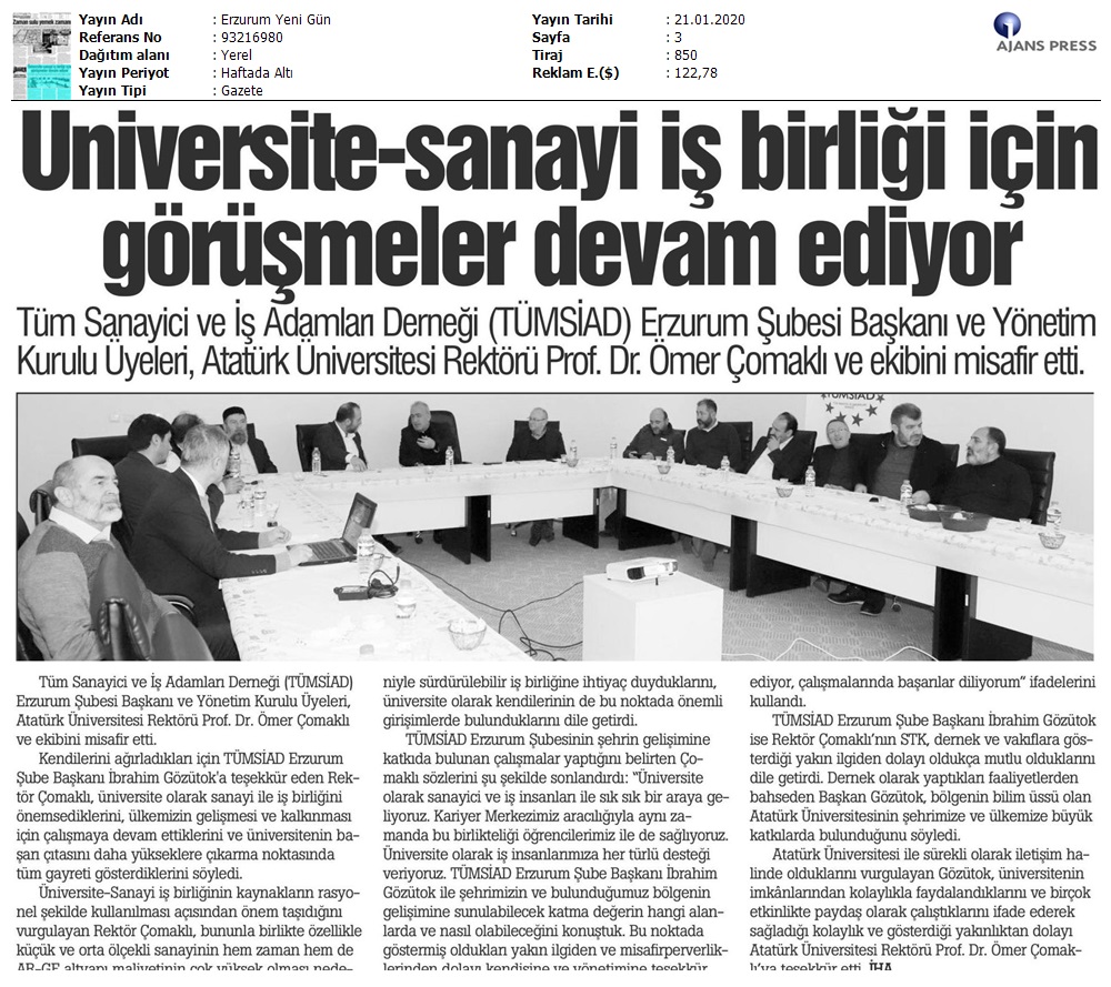 Tüm Sanayici Ve İş Adamları Derneği (TÜMSİAD) Erzurum şubesi başkanı ve yönetim kurulu üyeleri, Atatürk Üniversitesi Rektörü Prof. Dr. Ömer Çomaklı ve ekibini misafir etti.