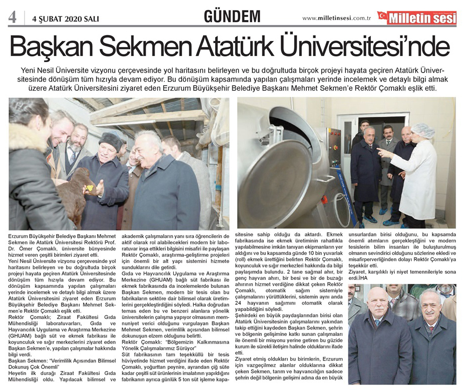 Yeni Nesil Üniversite vizyonu çerçevesinde yol haritasını belirleyen ve bu doğrultuda birçok projeyi hayata geçiren Atatürk Üniversitesinde dönüşüm tüm hızıyla devam ediyor. Bu dönüşüm kapsamında yapılan çalışmaları yerinde incelemek ve detaylı bilgi almak üzere Atatürk Üniversitesini ziyaret eden Erzurum Büyükşehir Belediye Başkanı Mehmet Sekmen’e Rektör Çomaklı eşlik etti.