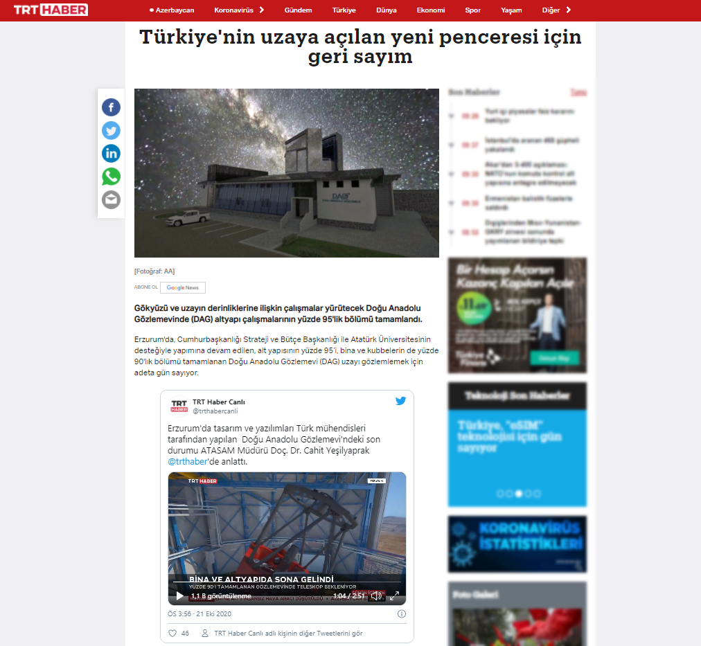 Coğrafi ve stratejik olarak bulunduğu enlem ve boylamda bu çapta başka teleskop olmadığı için büyük bir gözlemsel boşluğu doldurması beklenen Erzurum'daki teleskobun yer alacağı gözlemevinde, ilk ışığın 2021 yılında alınması gerekiyor.