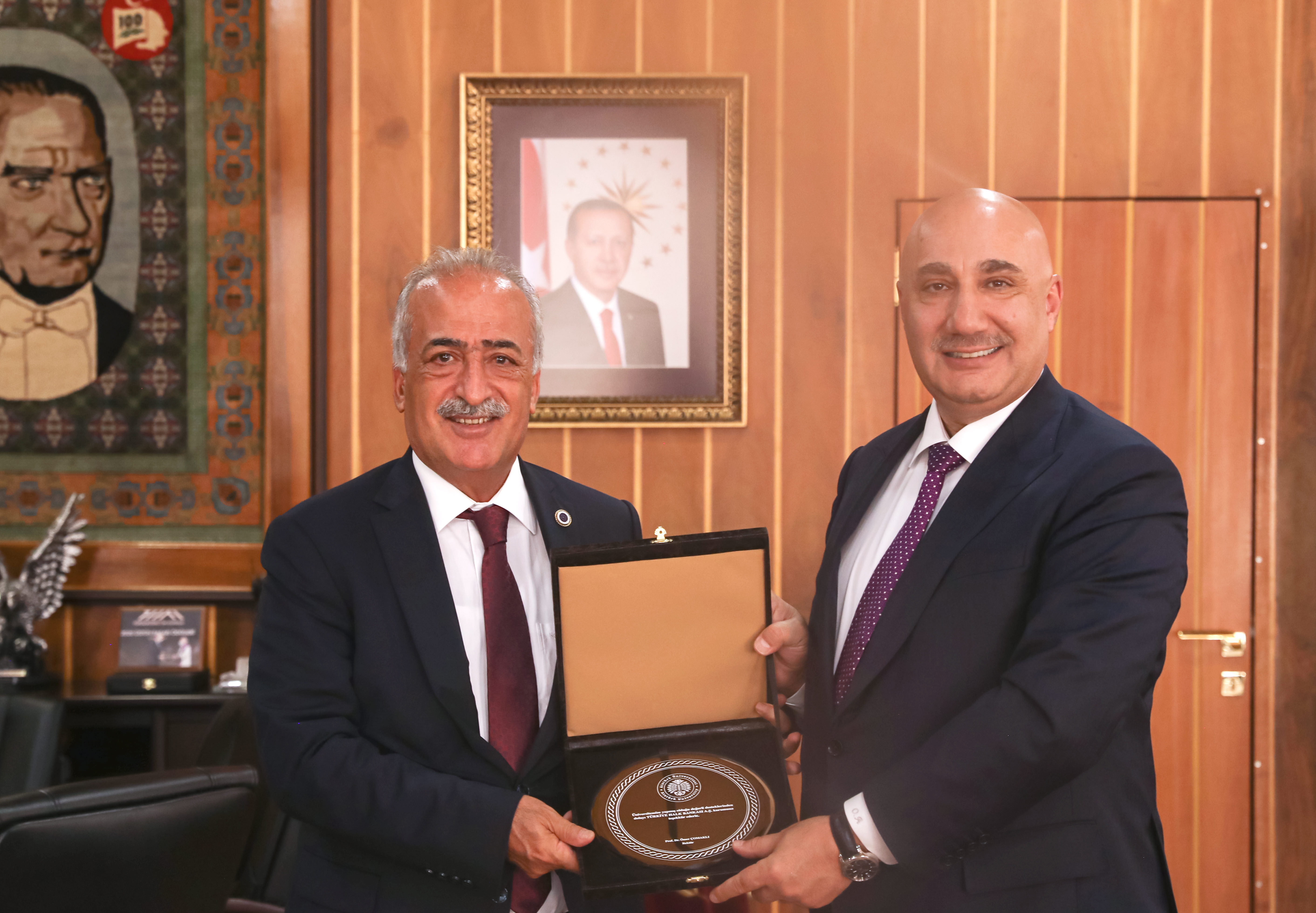 Atatürk Üniversitesi Süheyla-Sıtkı Alp Fen ve Anadolu Lisesinin yapım aşamasından eğitim hayatına başladığı ana kadar ki tüm süreçte Halkbank ve Ziraat Bankasının desteğini yakından hissettiklerini aktaran Rektör Çomaklı, iki kurumun yöneticileri nezdinde tüm Halkbank ve Ziraat Bankası ailesine verdikleri katkı dolayısıyla teşekkür plaketi verdi.