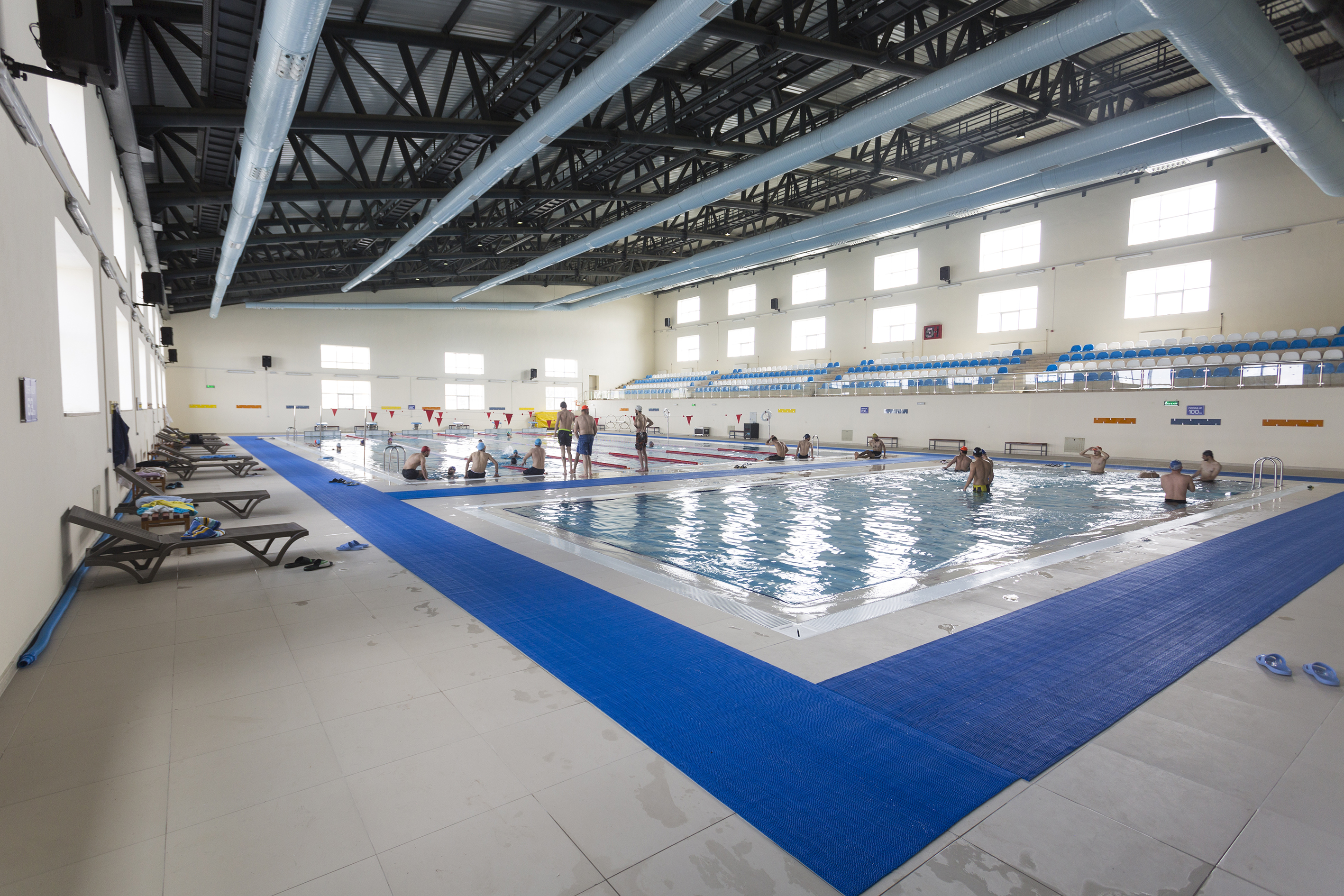 Yarı Olimpik Yüzme Havuzu, 25 metre uzunluk, 16 metre eninde ve 2 metre derinlikte olup sadece yüzme havuzu alanı olarak toplam 400 metrekare alana sahiptir. 6 kulvarı bulunan büyük havuz, havuz güverte alanı ve tribünleri ile yaklaşık 1000 metrekare alanda hizmet verilmektedir. Küçük havuz, 16 metre uzunlukta 5 metre eninde olup derinliği 63 santimetreden 1 metreye ulaşan, yüzme temel eğitimi için ideal ölçülerdedir. Üniversitemiz öğrencilerinin yüzme dersleri ve eğitimlerinin yapıldığı; üniversitemiz mensupları ve çocuklarının yüzme temel eğitimleri veya geliştirilmesi konusunda çalışmaların yapılabildiği havuzumuzda lisanslı eğitmenlerimiz ve cankurtaranlarımız hizmet verilmektedir. Yalnızca üniversite mensuplarımız için değil, şehirden gelen talepler doğrultusunda da Erzurum halkına da aynı eğitim hizmeti sunulmaktadır. Temel eğitimleri eğitmenler tarafından verilmiş olan çocuklar, yetenekleri doğrultusunda değerlendirilerek, Atatürk Üniversitesi Spor Kulübü Yüzme Şubesinin sporcusu olarak da değerlendirilebilmektedir.