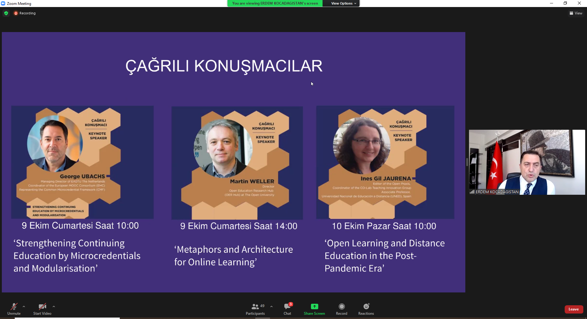 9-10 Ekim 2021 tarihlerinde çevrimiçi (online) olarak gerçekleştirilen “Pandemi Sonrası Dönemde Açık Öğrenme ve Uzaktan Eğitim” temalı kongrenin açılış konuşmaları kongrenin kurucu başkanı ve aynı zamanda Açıköğretim Fakültesi Dekanı Prof. Dr. Erdem Kocadağıstan ile başladıktan sonra Uzaktan Eğitim Uygulama ve Araştırma Merkezi Müdürü Doç. Dr. Engin Kurşun’la devam etti.