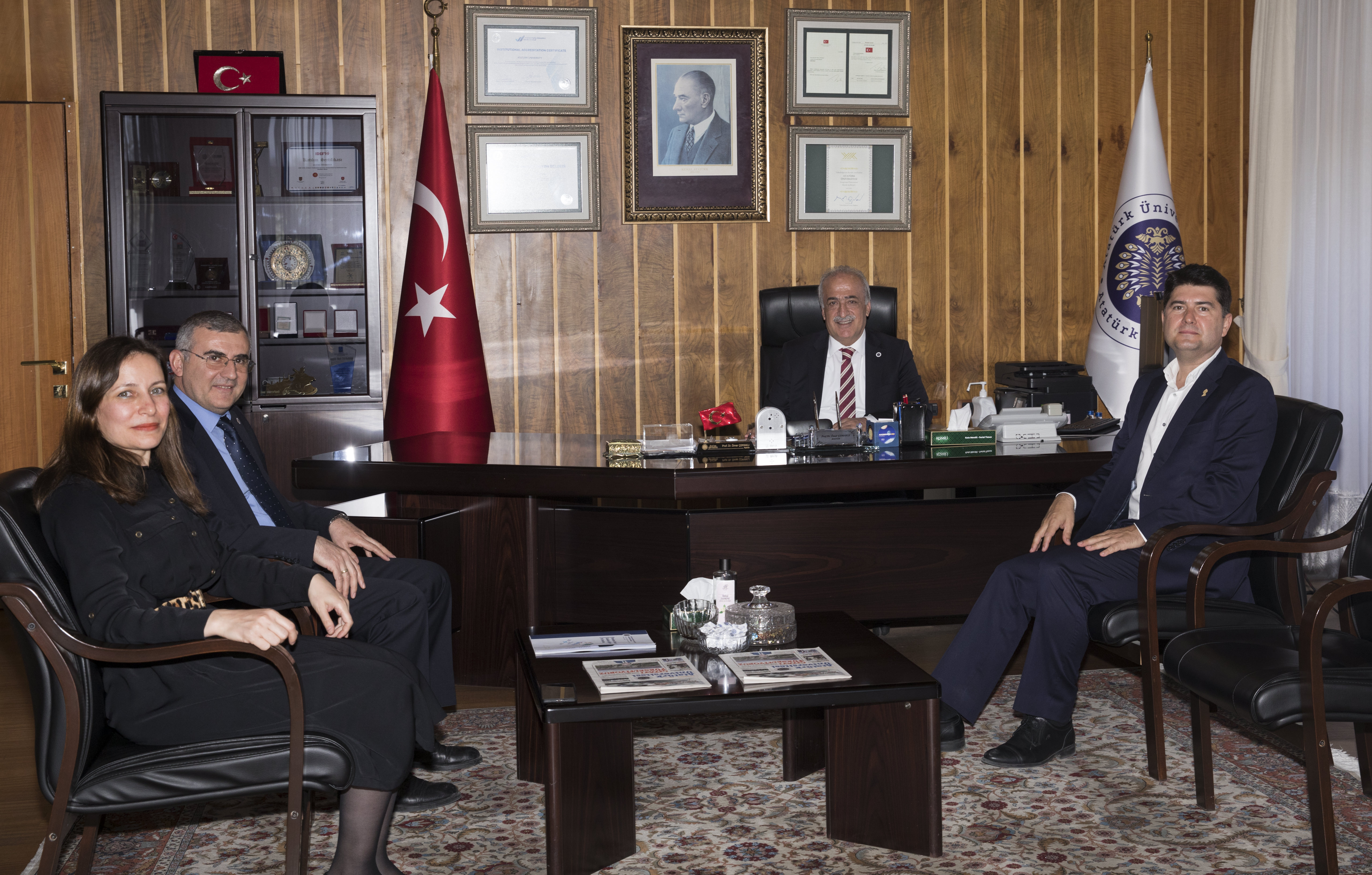 Prof. Dr. Martinez konferans sonrasında ise Atatürk Üniversitesi Rektörü Prof. Dr. Ömer Çomaklı’yı ziyaret etti. Rektör Yardımcıları Prof. Dr. Ayşe Bayrakçeken Yurtcan ile Prof. Dr. Mustafa Sözbilir’in de yer aldığı ziyarette Rektör Çomaklı, misafiri ile yakından ilgilenerek temel bilimlere yönelik üniversite bünyesinde yapılan çalışmalardan bahsetti. Prof. Dr. Martinez ise Atatürk Üniversitesinin genel olarak gelişmiş altyapısı, şehrin kalkınmasına yaptığı katkı ve Kimya Bölümünün araştırmacı kapasitesinden çok etkilendiğini dile getirdi. Atatürk Üniversitesinden birçok öğretim üyesi ile tanıştığını, bu öğretim üyelerinin kimya ve kimya öğretimine yaptığı bilimsel katkılardan haberdar olduğunu ifade eden Martinez, bu kapsamda düzenlenen programların da oldukça verimli geçtiğini aktardı.