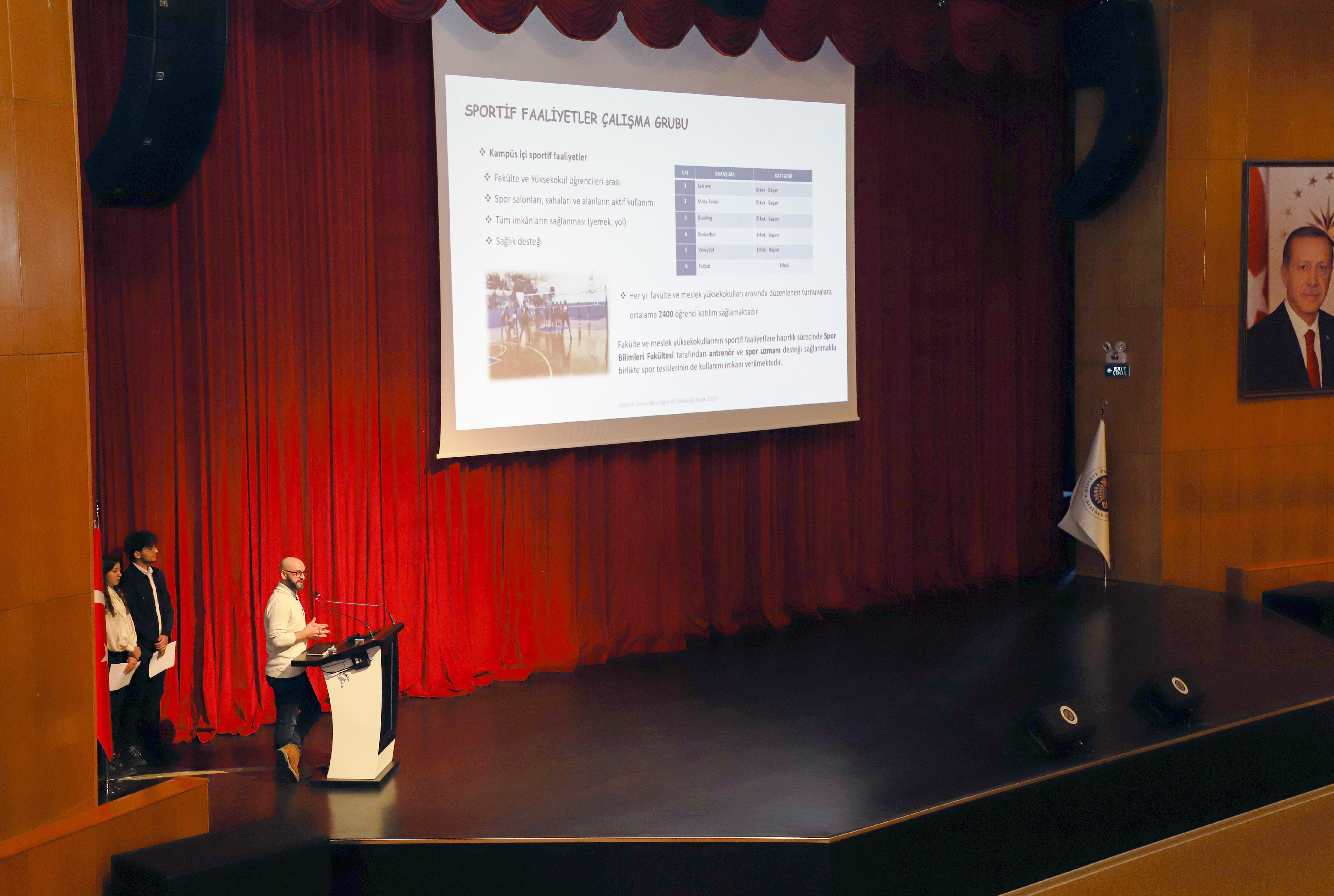6 başlık halinde gerçekleşen programda, Sosyal, Sanatsal ve Kültürel Faaliyetler Çalışma Grubu Sunumunu Öğr. Gör. Oğuzhan Özakın, Sportif Faaliyetler Çalışma Grubu Sunumunu Arş. Gör. Levent Önal, Bilgiye Erişim (Kütüphane, İnternet) Çalışma Grubu Sunumunu Doç. Dr. Ceyhun Özan, Kampüste Fiziki İmkânlar (Derslikler, Rekreasyon alanları) Çalışma Grubu Sunumunu Dr. Öğr. Üyesi Ahmet Atalay, Sağlık, Psikolojik Danışma ve Rehberlik Hizmetleri Çalışma Grubu Sunumunu Dr. Öğr. Üyesi Mehmet Akif Naz, Temel İhtiyaçlar (Barınma, Yemekhaneler ve Kantinler, Güvenlik, Ulaşım) Çalışma Grubu Sunumunu ise Arş. Gör. Volkan Acar yaparken öğrencilerden gelen çeşitli sorulara da aydınlatıcı cevaplar verildi.