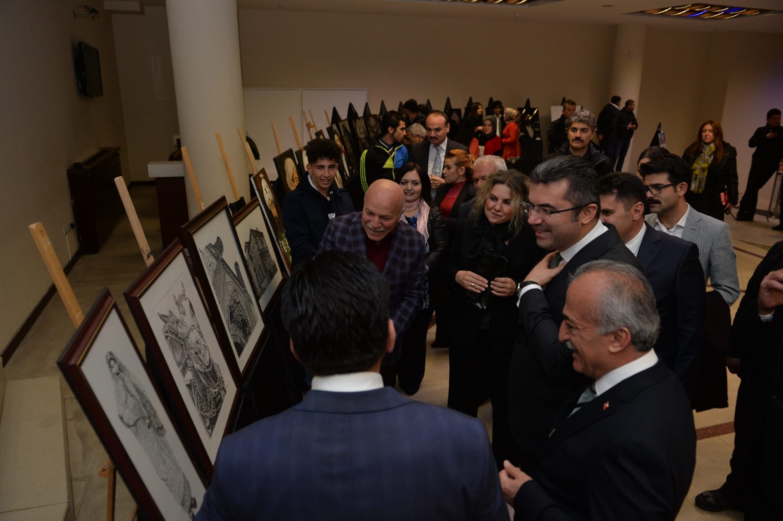 Programa katılmak üzere salona gelen konuklar, Yakutiye Güzel Sanatlar Lisesi öğretmen ve öğrencileri tarafından yapılan ayna üzerine resim sanatı, yağlı boya ve pilot kalem ile çizilen resim sergisi gezdiler.