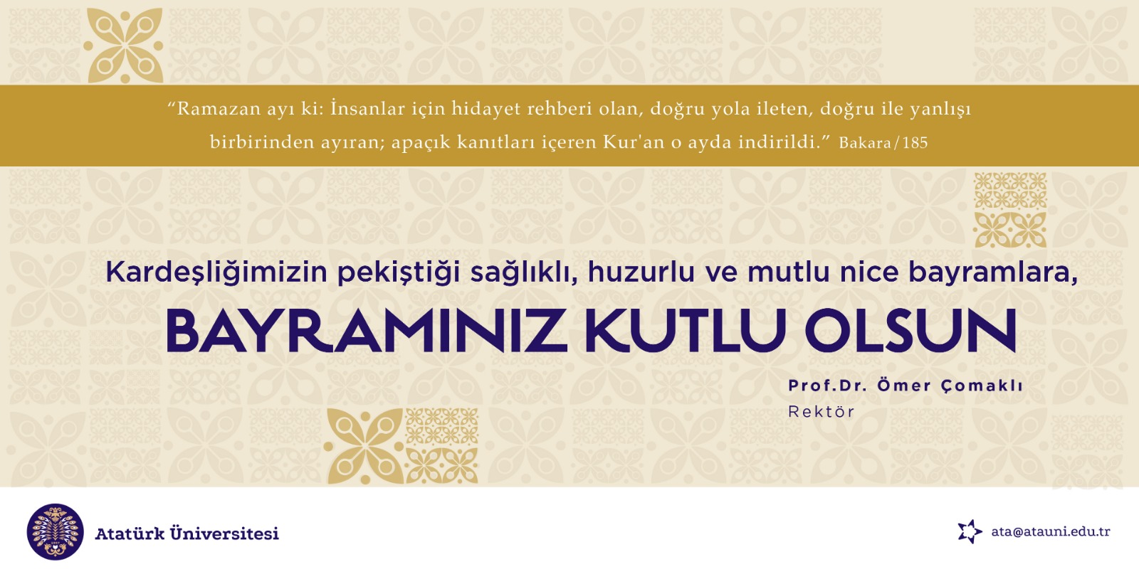 Atatürk Üniversitesi Rektörü Prof. Dr. Ömer Çomaklı, Ramazan Bayramı nedeniyle bir mesaj yayımladı. Rektör Çomaklı mesajında şu ifadelere yer verdi: