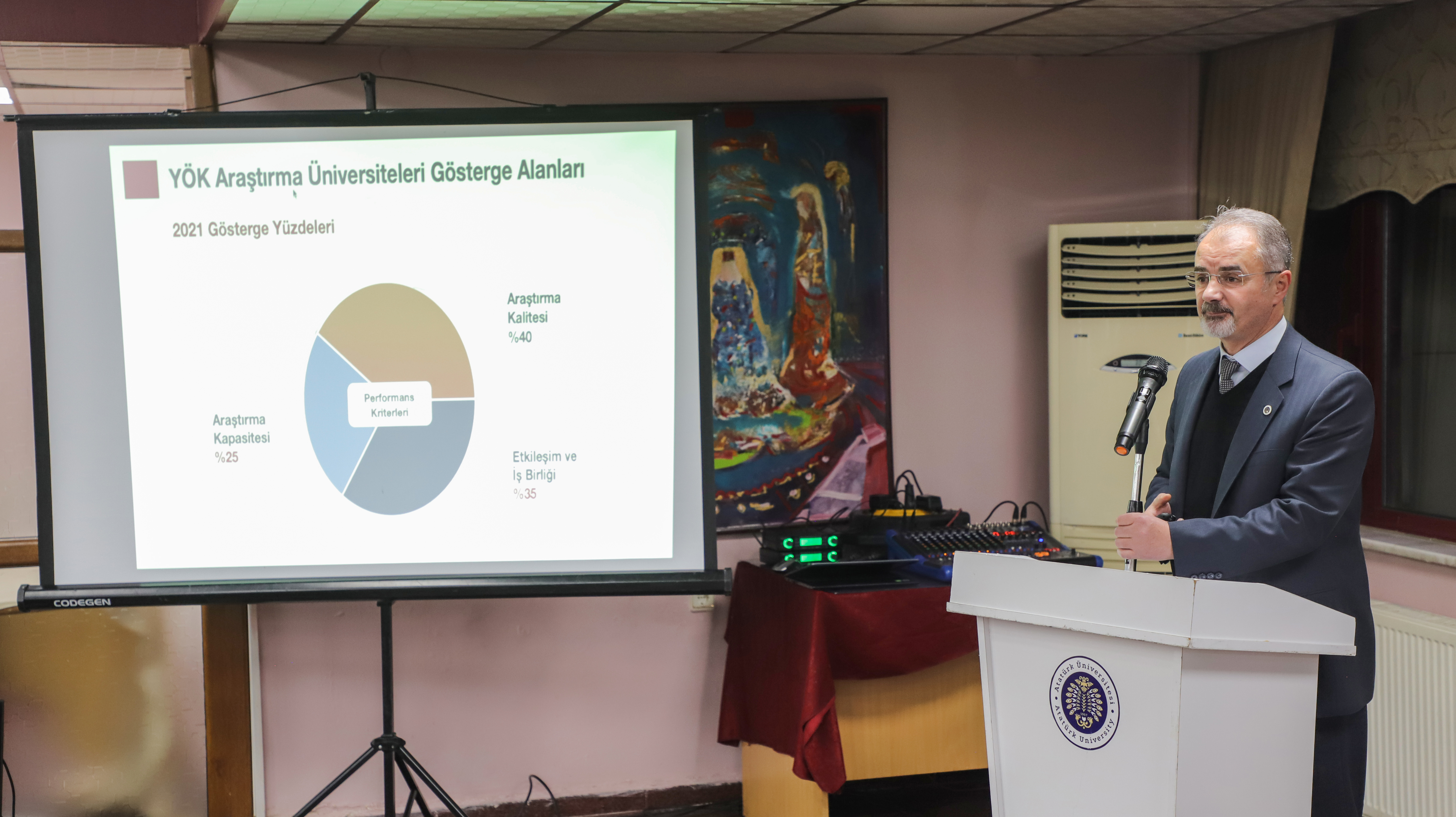 Üniversite tarafından gerçekleştirilen bilimsel ve akademik çalışmalar, teşvik ve destek programları ile gerçekleştirilmesi planlanan projelere yönelik akademisyenler ile bir araya gelen Rektör Çomaklı; alınan ödüller ve saygın sıralama kuruluşlarında yakalanan başarının, üstün gayret ve özverili çalışmayla mümkün olduğunu belirterek şunları söyledi: “Üniversitemizin ihtiyacı olan gelişmelerde AR-GE boyutu, öğrenci odaklı faaliyetler ve toplumsal katkı anlamında sizlerle birlikteliklerimizi ortaya koyarken, sadece istatiksel olarak değil, sizlerin gönüllerine hitap ederek, varsa problemlerimizi, karşılıklı çözmek suretiyle gerçekten daha üst düzeyde nasıl çalışmalar ortaya koyarız onun çabası içerisindeyiz.”