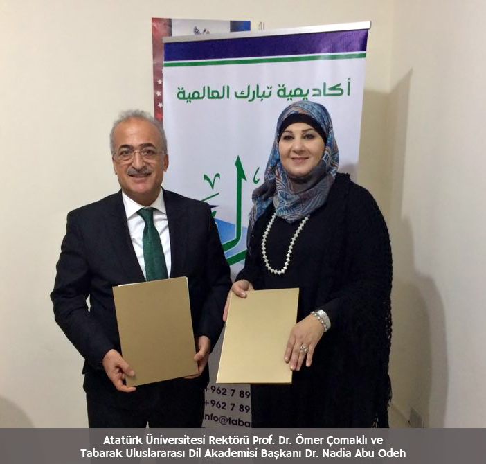 Günün üçüncü ziyaretini Tabarak Uluslararası Dil Akademisine gerçekleştiren Rektör Çomaklı, Akademi Başkanı Dr. Nadia Abu Odeh ile ikili işbirliği protokolü imzaladı. İmzalanan protokol kapsamında; Atatürk Üniversitesi Kampüsü içerisinde “Arap Dili Kültür Merkezi” açılması kararlaştırıldı. İletişim konusunda yaşanan sorunların çözümüne katkı sunmak için halka açık olacak Arap Dili Kültür Merkezi, Türk-İslam sanatları alanında da üniversite içinden ve dışından bireylere hizmet vermeyi hedefliyor.