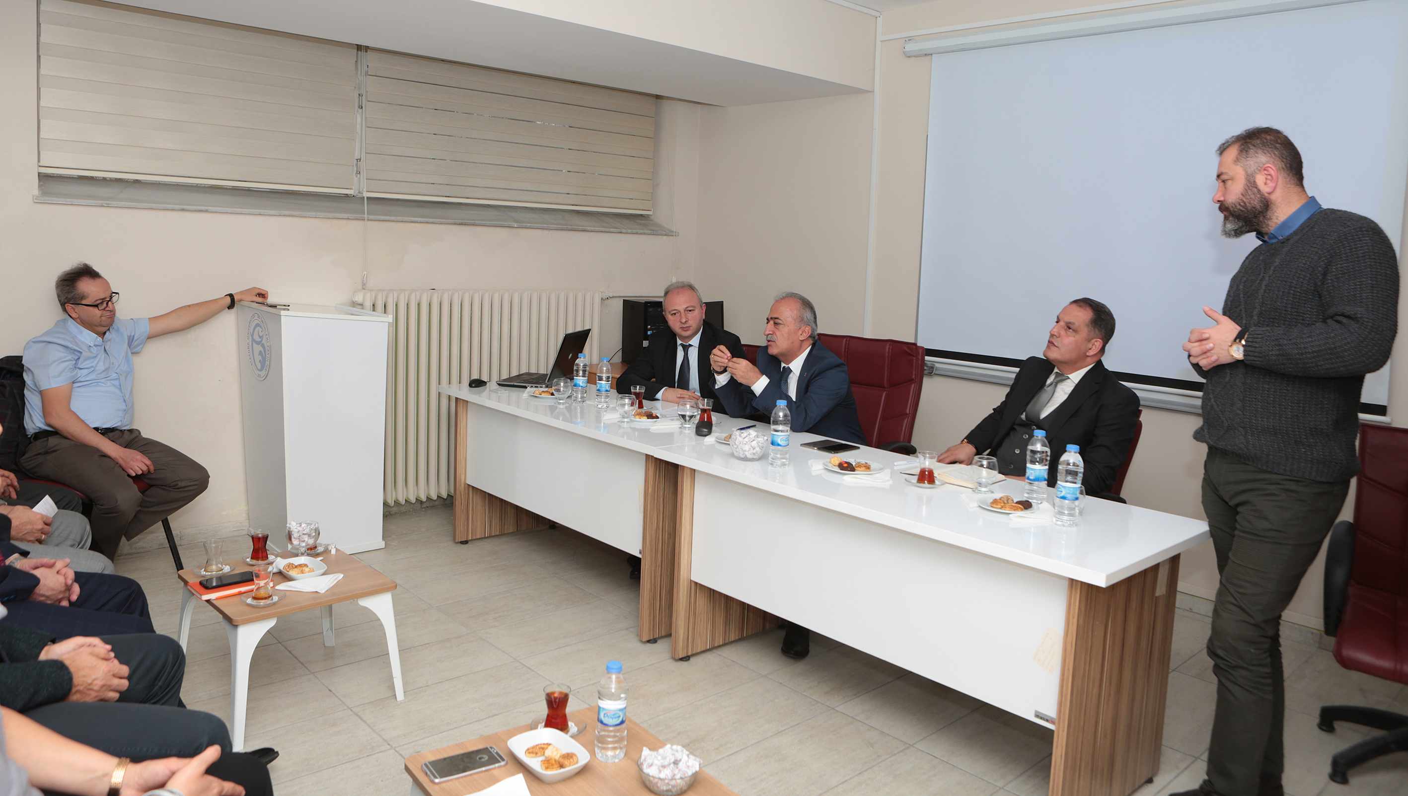 Veteriner ve Su Ürünleri Fakültelerini ziyaret ederek bir dizi incelemelerde bulunan Atatürk Üniversitesi Rektörü Prof. Dr. Ömer Çomaklı ve yönetimi, fakültelerin konferans salonlarında akademisyenlerle bir araya gelerek, çalışmalar ve eğitim faaliyetleri hakkında fikir alışverişinde bulundu.