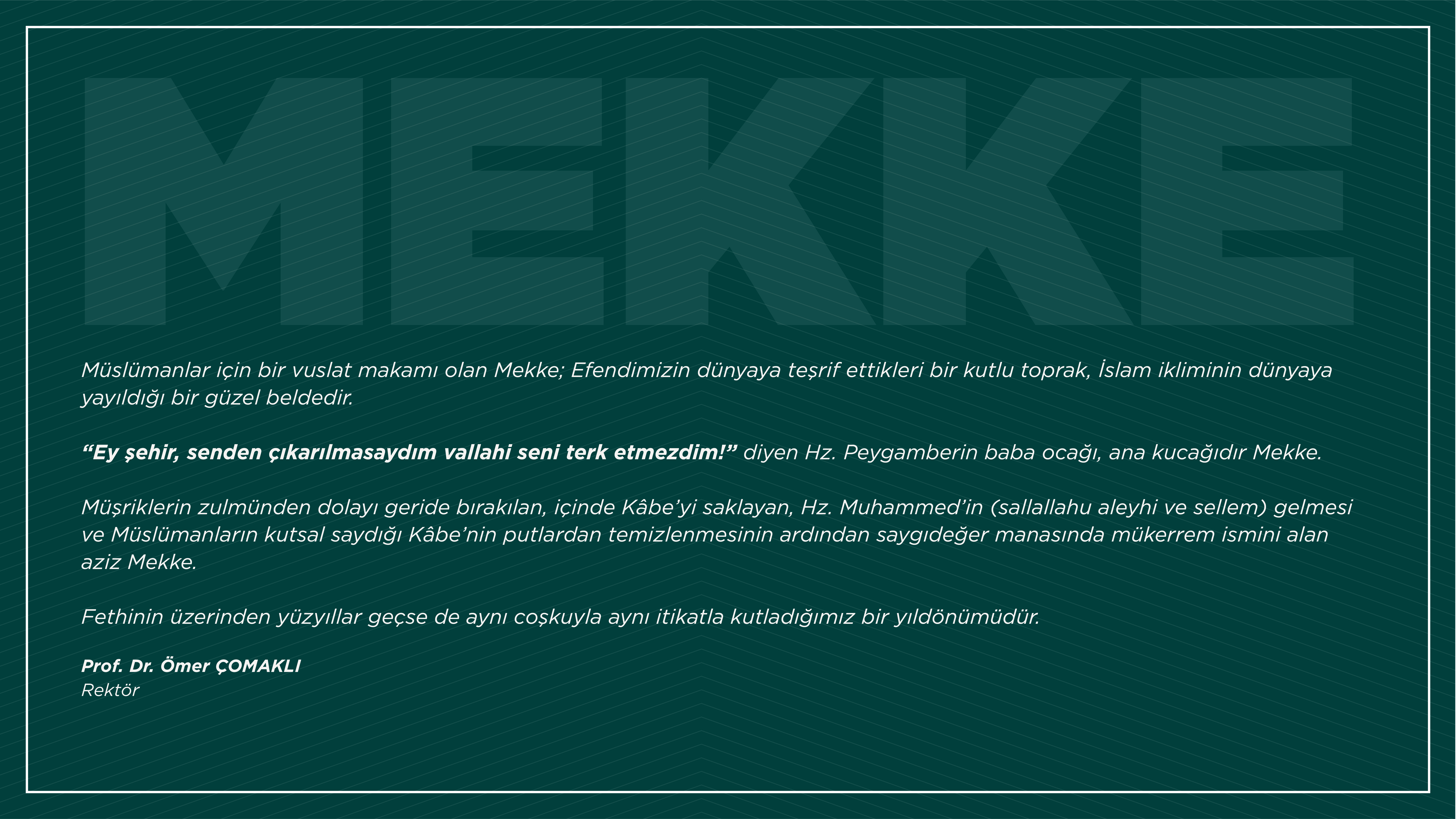 Müşriklerin zulmünden dolayı geride bırakılan, içinde Kâbe’yi saklayan, Hz. Muhammed’in (sallallahu aleyhi ve sellem) gelmesi ve Müslümanların kutsal saydığı Kâbe’nin putlardan temizlenmesinin ardından saygıdeğer manasında mükerrem ismini alan aziz Mekke.