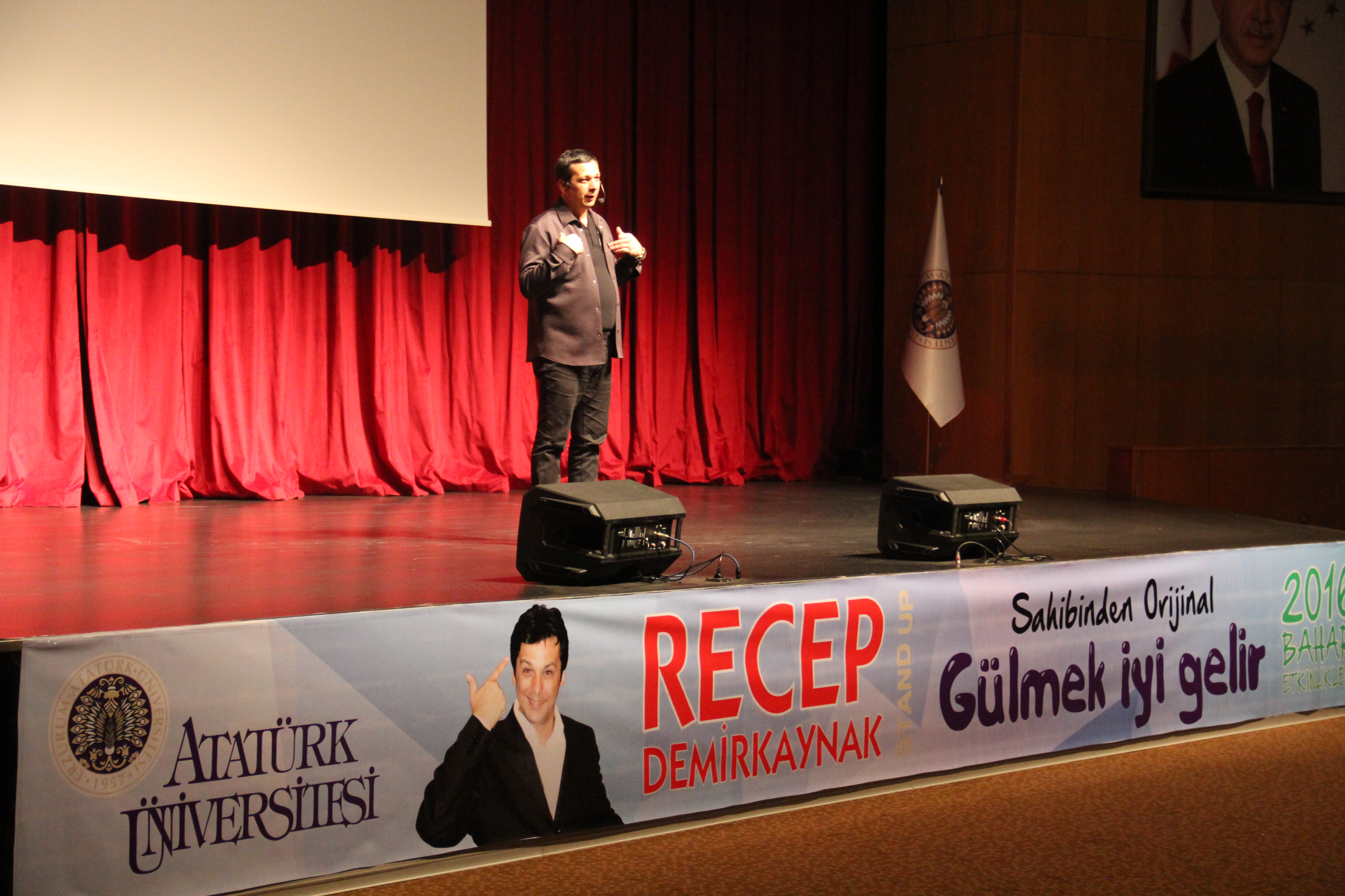Atatürk Üniversitesi 2016 Bahar Şenlikleri kapsamında düzenlenen etkinlikler tüm hızıyla devam ediyor. Sahibinden Gülmek İyi Gelir isimli Stand Up gösterisiyle Atatürk Üniversitesi öğrencileriyle bir araya gelen komedyen Recep Demirkaynak, yaptığı esprileriyle büyük beğeni topladı.