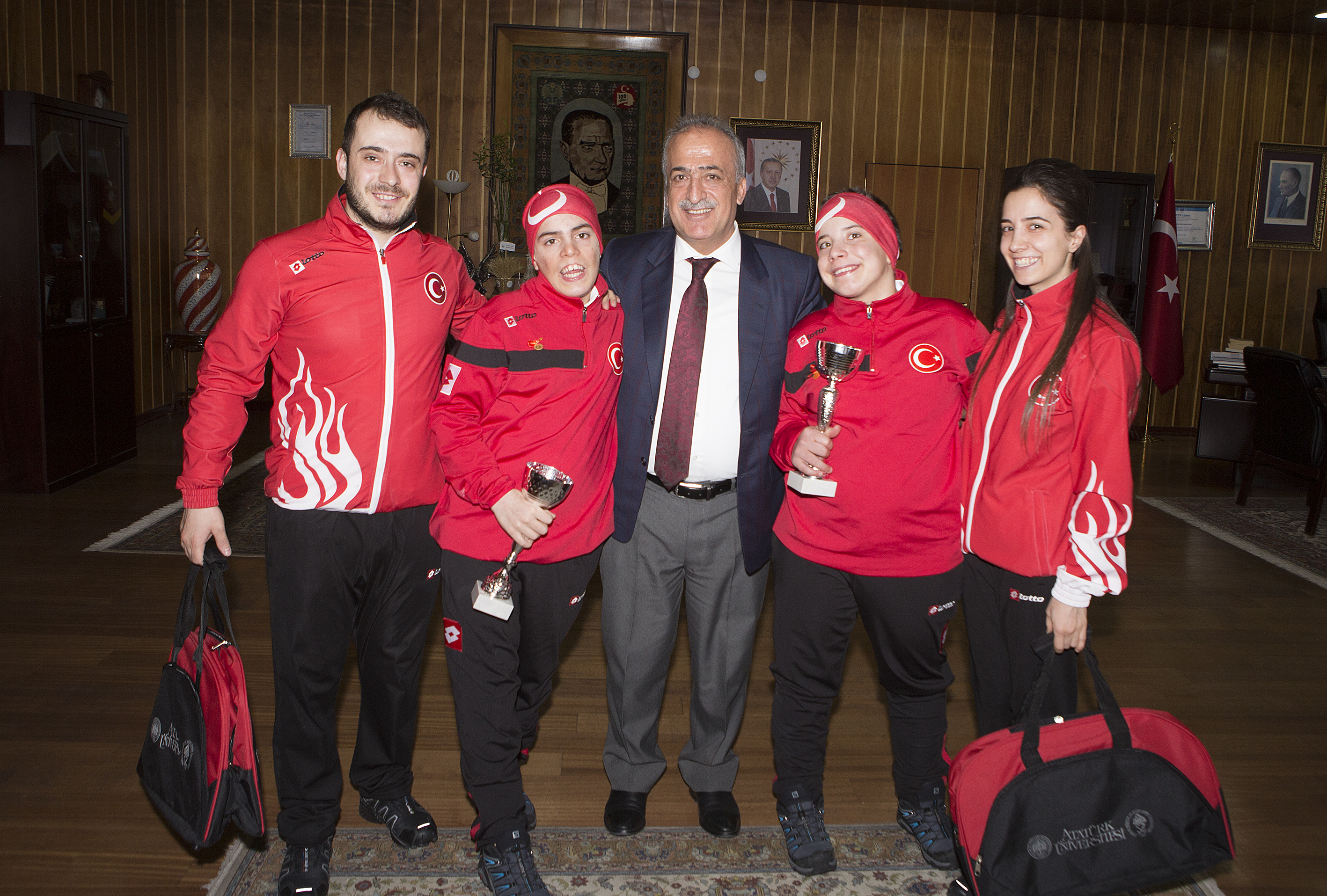 INAS Zihinsel Engelliler Dünya Kayak Şampiyonasında, Gelecek Vaat Eden En İyi Otizmli Kayak Sporcuları Ödülünü kazanan Aliye Zeynep ve Muhsin Murat Bingül kardeşler, şampiyonluk sevincini Atatürk Üniversitesi Rektörü Prof. Dr. Ömer Çomaklı ile paylaştı.