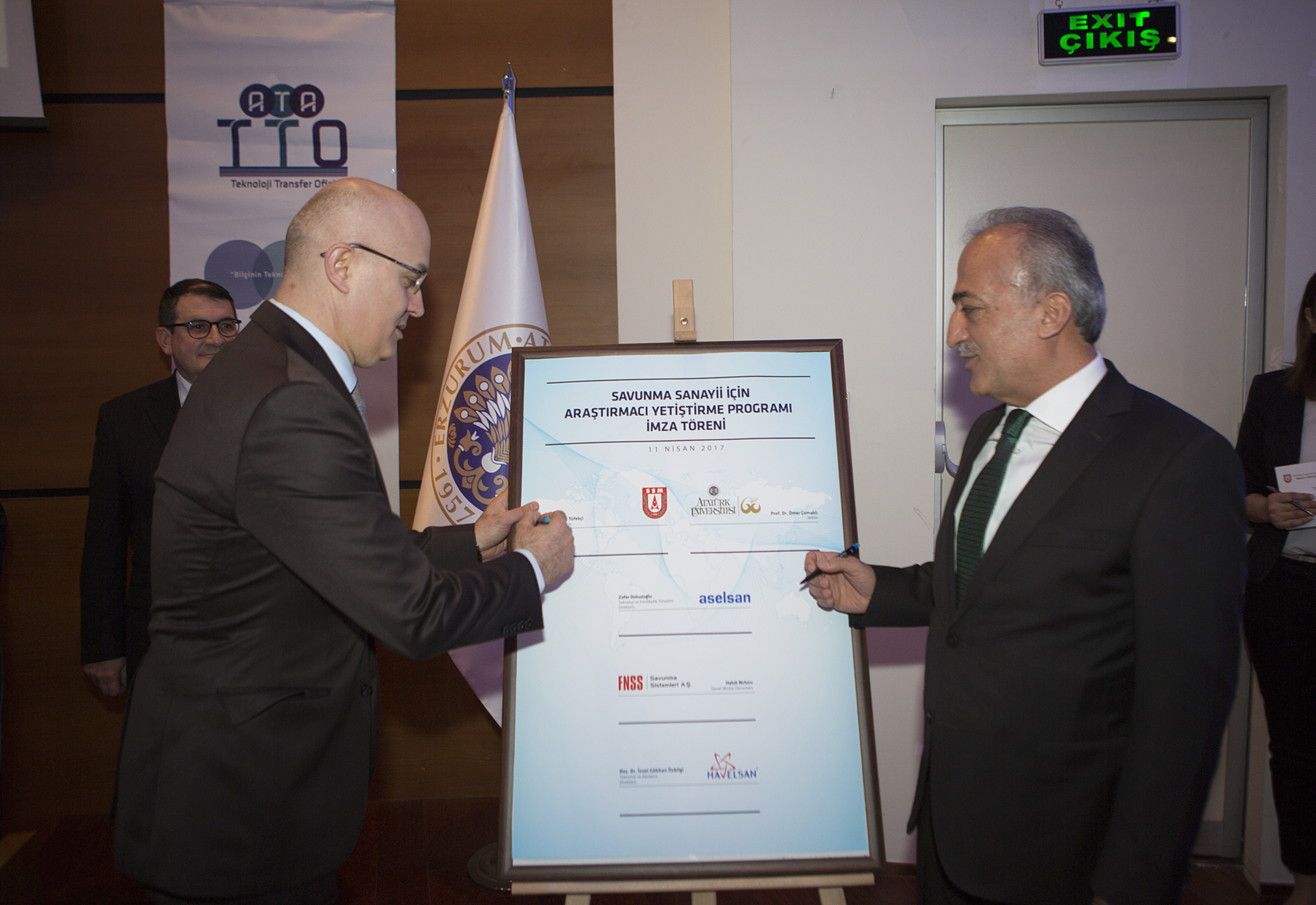 Açılış konuşmalarının ardından imza törenine geçildi. İki kurumun temsilcileri olan Savunma Sanayi Müsteşar Yardımcısı Celal Sami Tüfekçi ve Atatürk Üniversitesi Rektörü Prof. Dr. Ömer Çomaklı, yeni bir iş birliğinin protokol metnini imzaladılar.