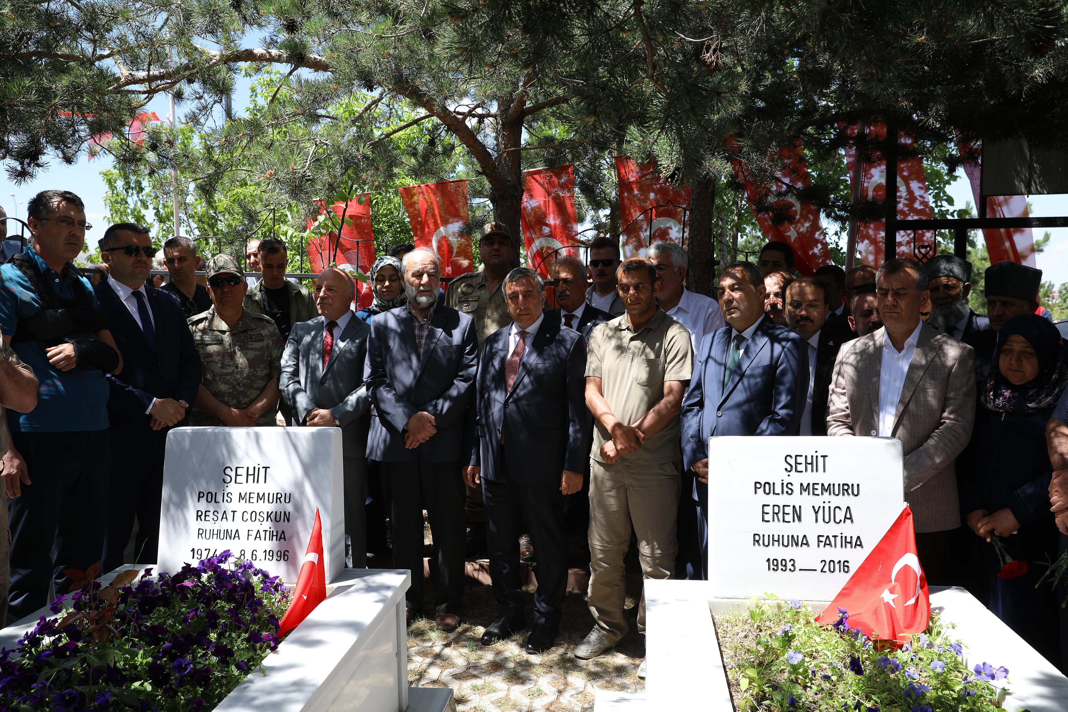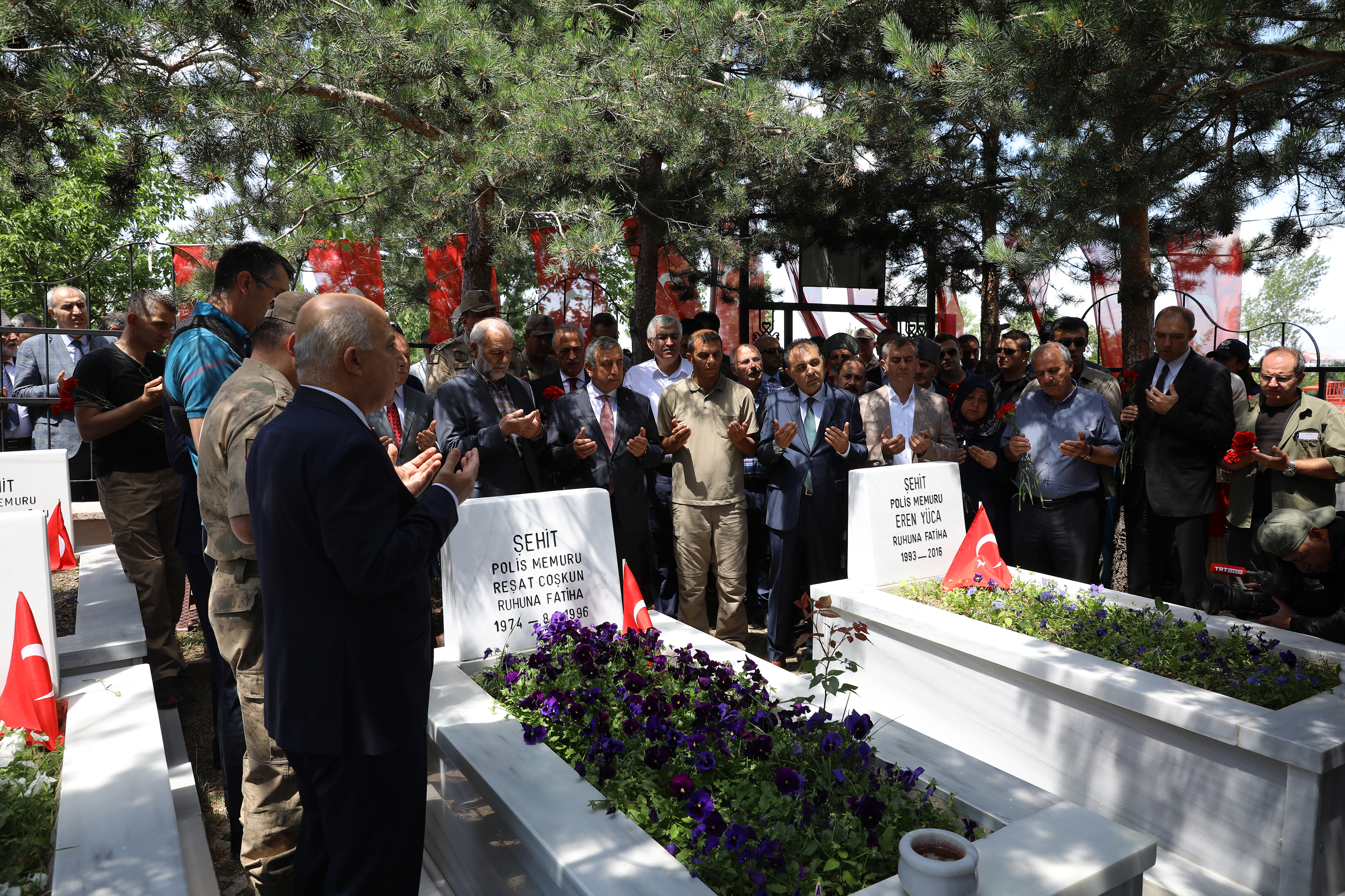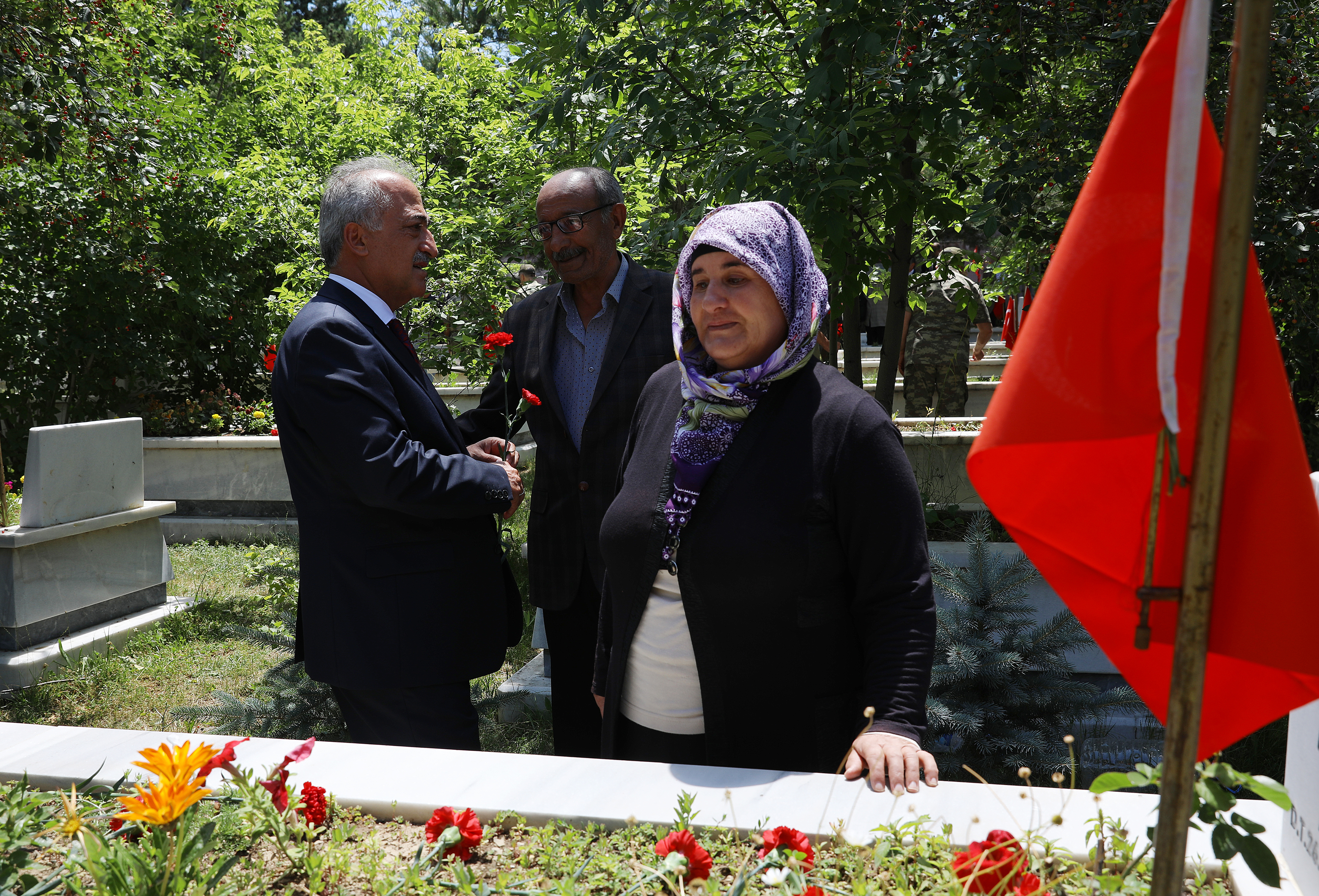 Programda saygı duruşu ve İstiklal Marşı’nın okunmasının ardından şehit mezarları ziyaret edilerek dua edildi ve şehitliklere karanfil bırakıldı. Şehitliklerde bulunan aziz şehitlerimizin kabirlerini tek tek ziyaret ederek dualar okuyan Rektör Çomaklı ile şehit aileleri arasında duygusal anlar yaşandı.