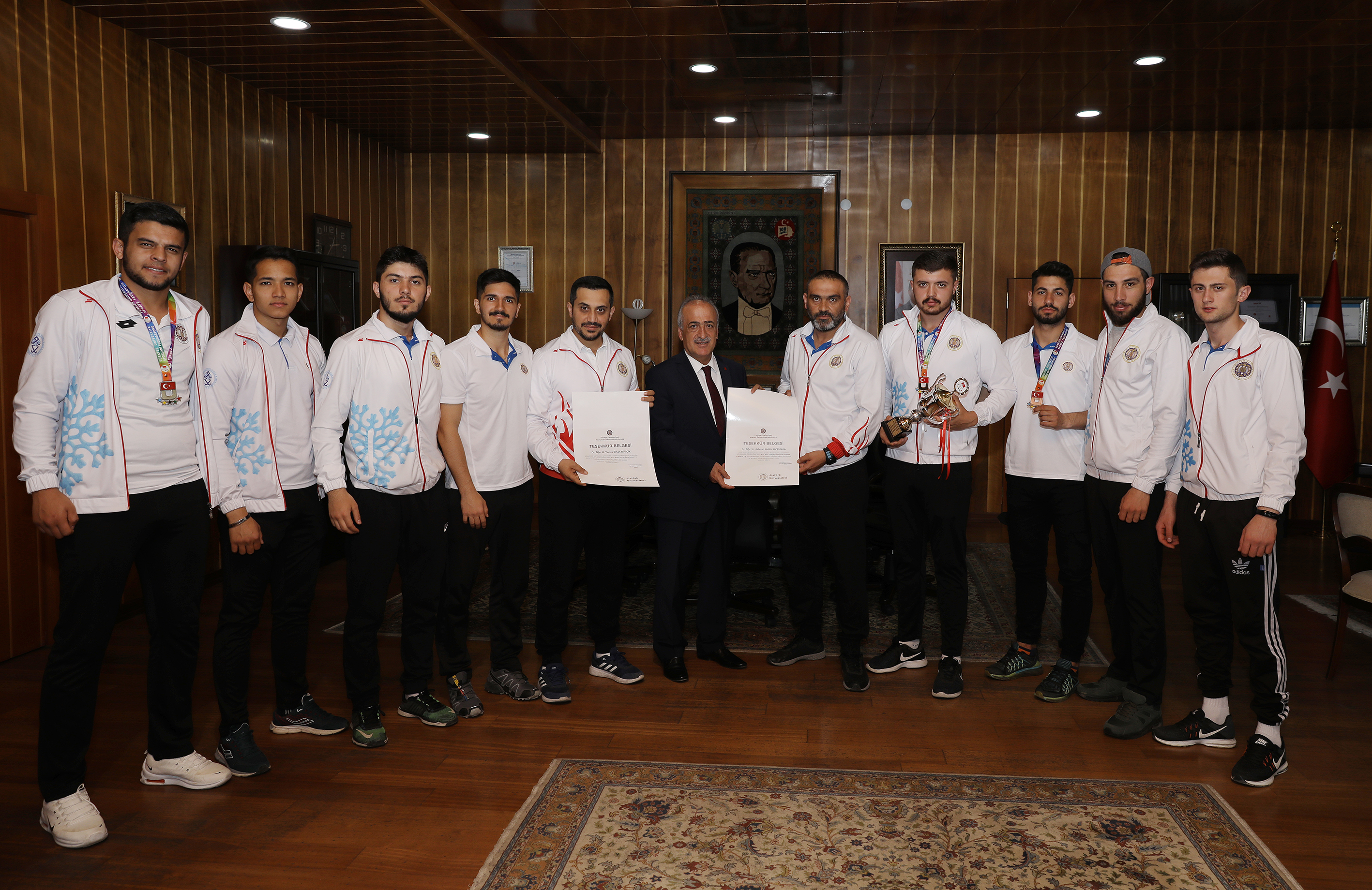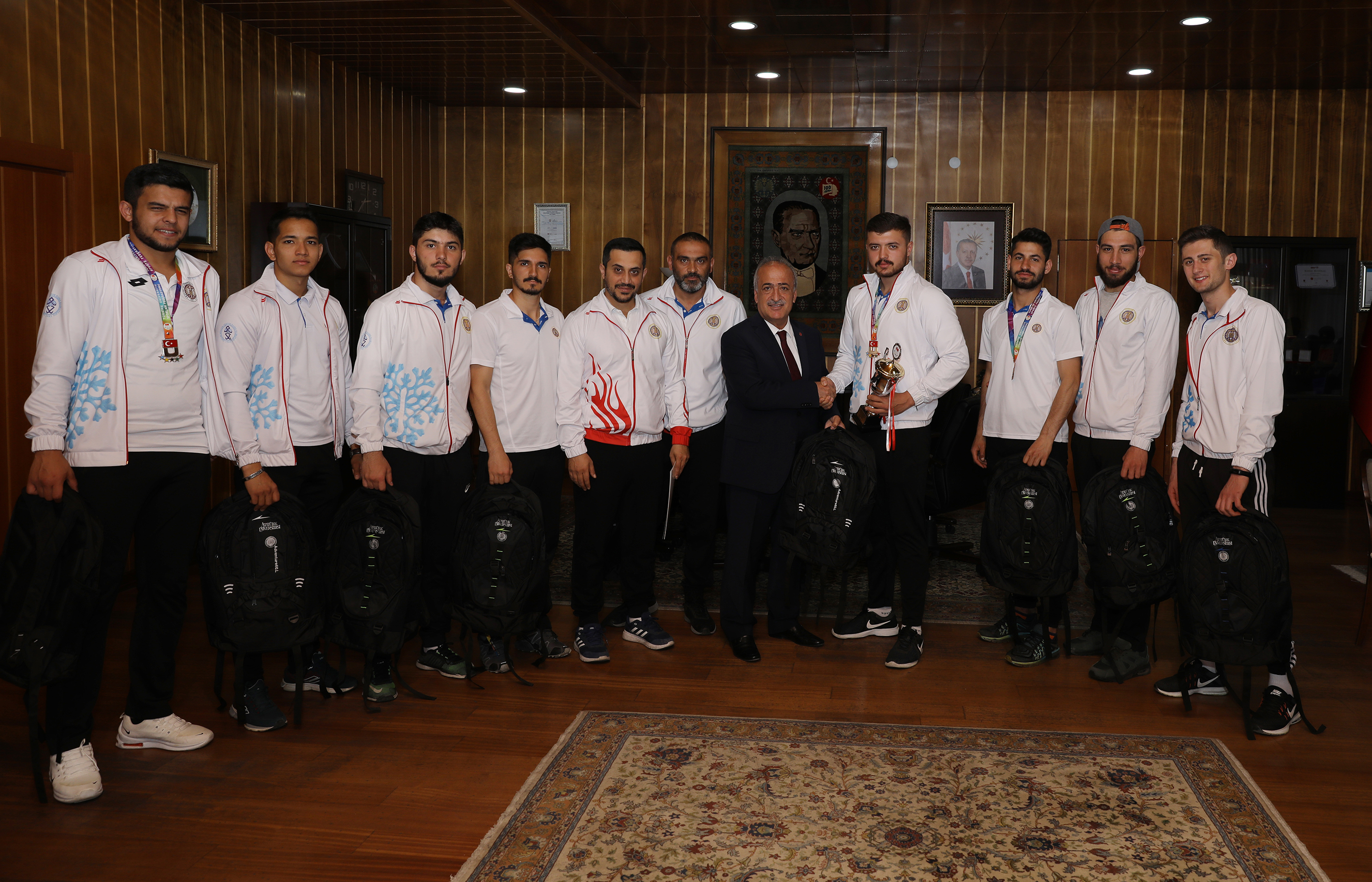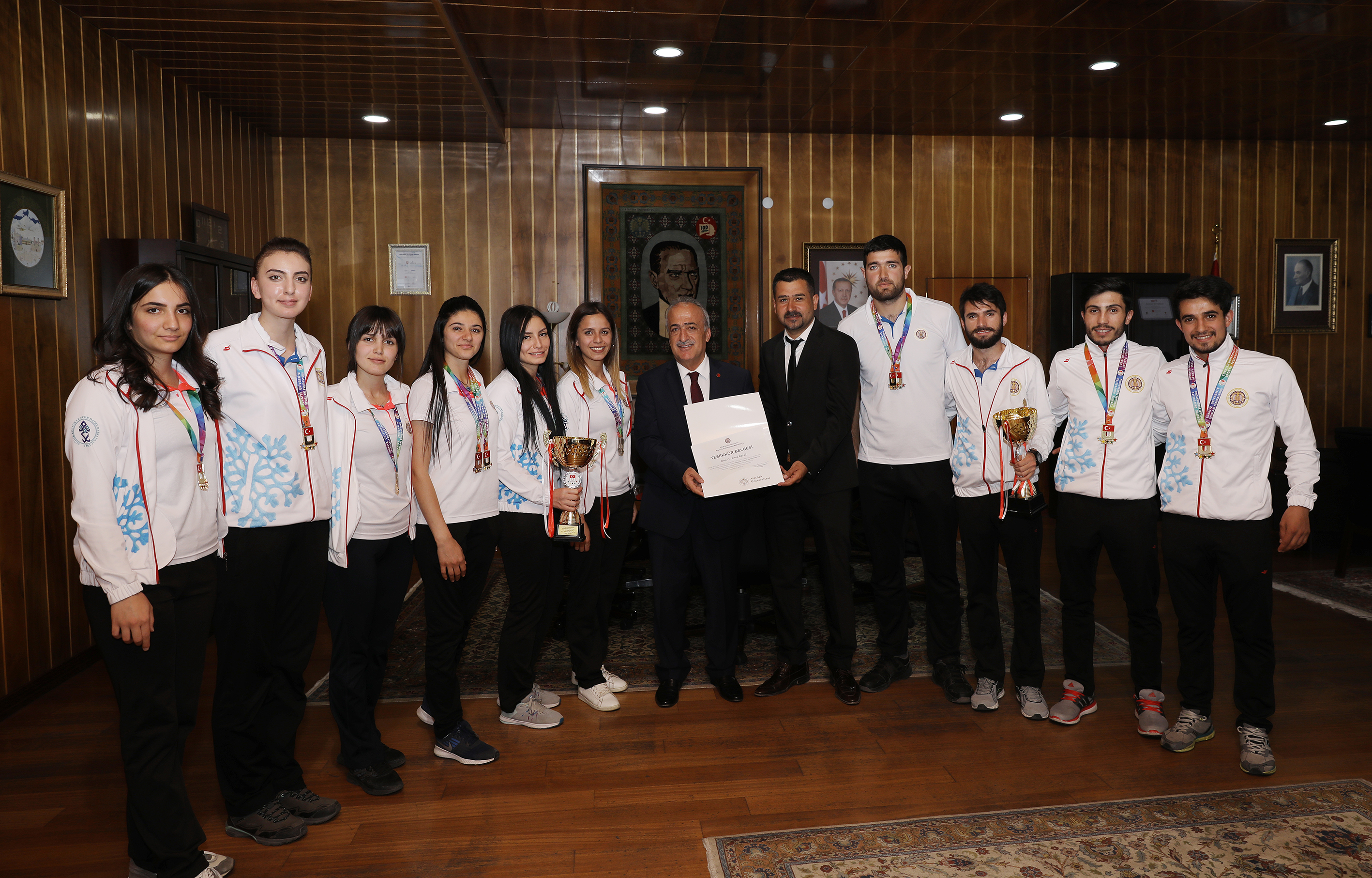 Türkiye Üniversite Sporları Federasyonu (TÜSF) tarafından düzenlenen Üniversiteler Arası Spor Müsabakalarında takım sporları ve bireysel sporlarda derece elde eden öğrenciler Rektör Prof. Dr. Ömer Çomaklı’yı ziyaret etti.