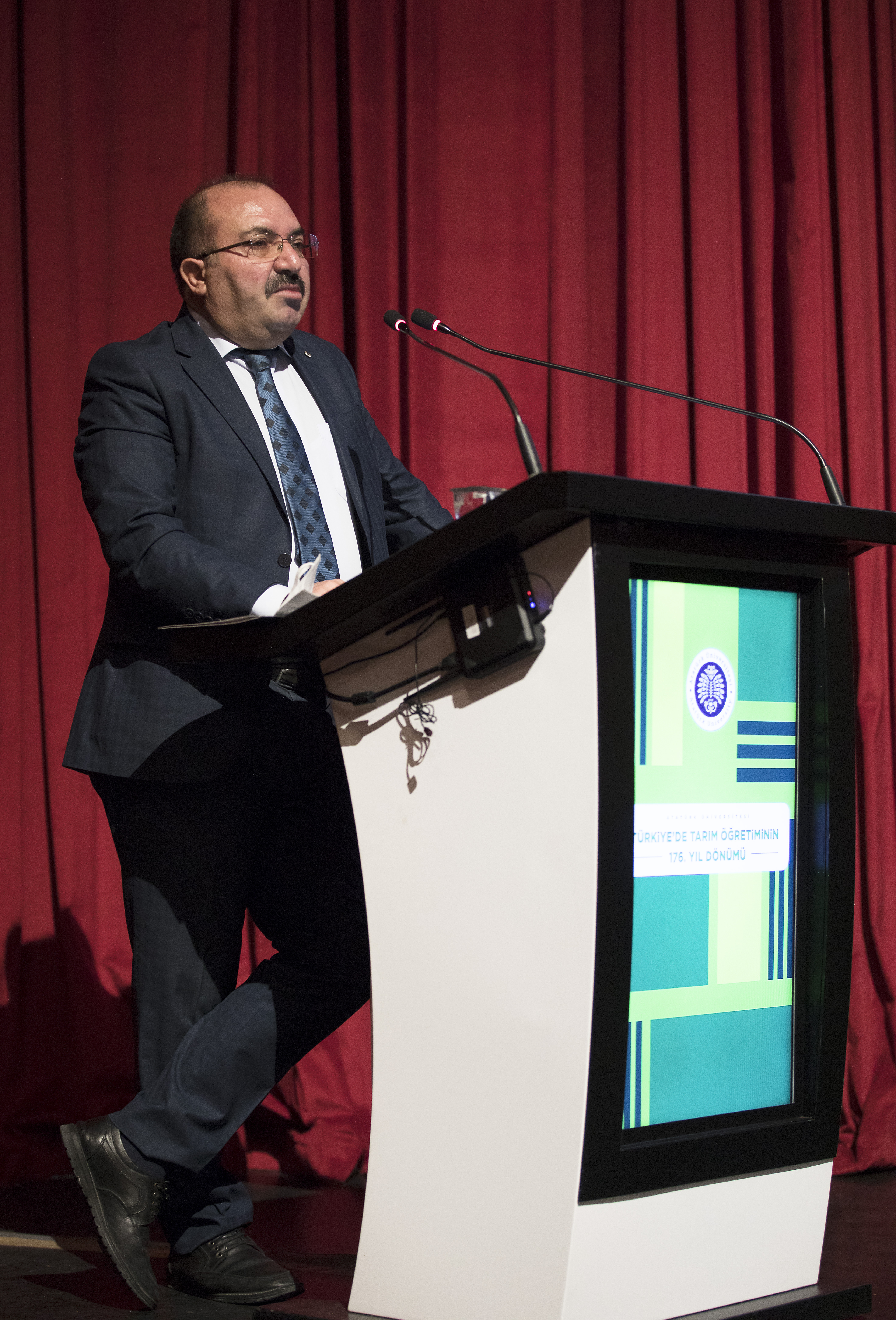 Son olarak kürsüye çıkan YÖK Denetleme Kurulu Üyesi Prof. Dr. İrfan Aslan: “Yaklaşık 30 yıl görev yaptığım üniversitede konuşma yapıyor olmaktan büyük bir mutluluk duyduğumu belirtmek isterim. Biz tarımın Hz. Âdem ile başladığına inanıyoruz. İlk öğretici ilk çiftçidir. İnsanoğlu hiçbir zaman cahil olmamıştır. Tarımın verimli hilal olarak adlandırılan ve Güney Doğu Anadolu’yu da içine alan en az 10 bin yıl önce başladığı kabul edilmektedir. O günden bugüne kadar insanların yaşamasının temel unsuru olan yeme-içme faaliyetlerini sağlayan tarımsal üretim, insanoğlu için hayati bir öneme sahiptir. Ülkemizde son yıllarda gerek akademik ve bilimsel çalışmalar ile gerekse de devletimizin destekleri ile tarımda verimi en üst seviyeye çıkarmak için yoğun gayret gösterilmektedir. Ülke yükseköğretimi bu konuda üzerine düşeni yaparak birçok ön lisans ve lisans programları ile alanında uzman bireyler yetiştirerek toprağı bilimsel bilgi ile işleme noktasında gayret sarf etmektedir. Ülkemizin en eski fakülteleri arasında yer alan ve kurulan ilk üç fakülte arasında yer alan Atatürk Üniversitesi Ziraat Fakültesinin ev sahipliğinde düzenlenen Tarım Öğretiminin 176. yılını kutluyor, emeği geçenlere teşekkürlerimi sunuyorum” ifadelerini kullandı.
