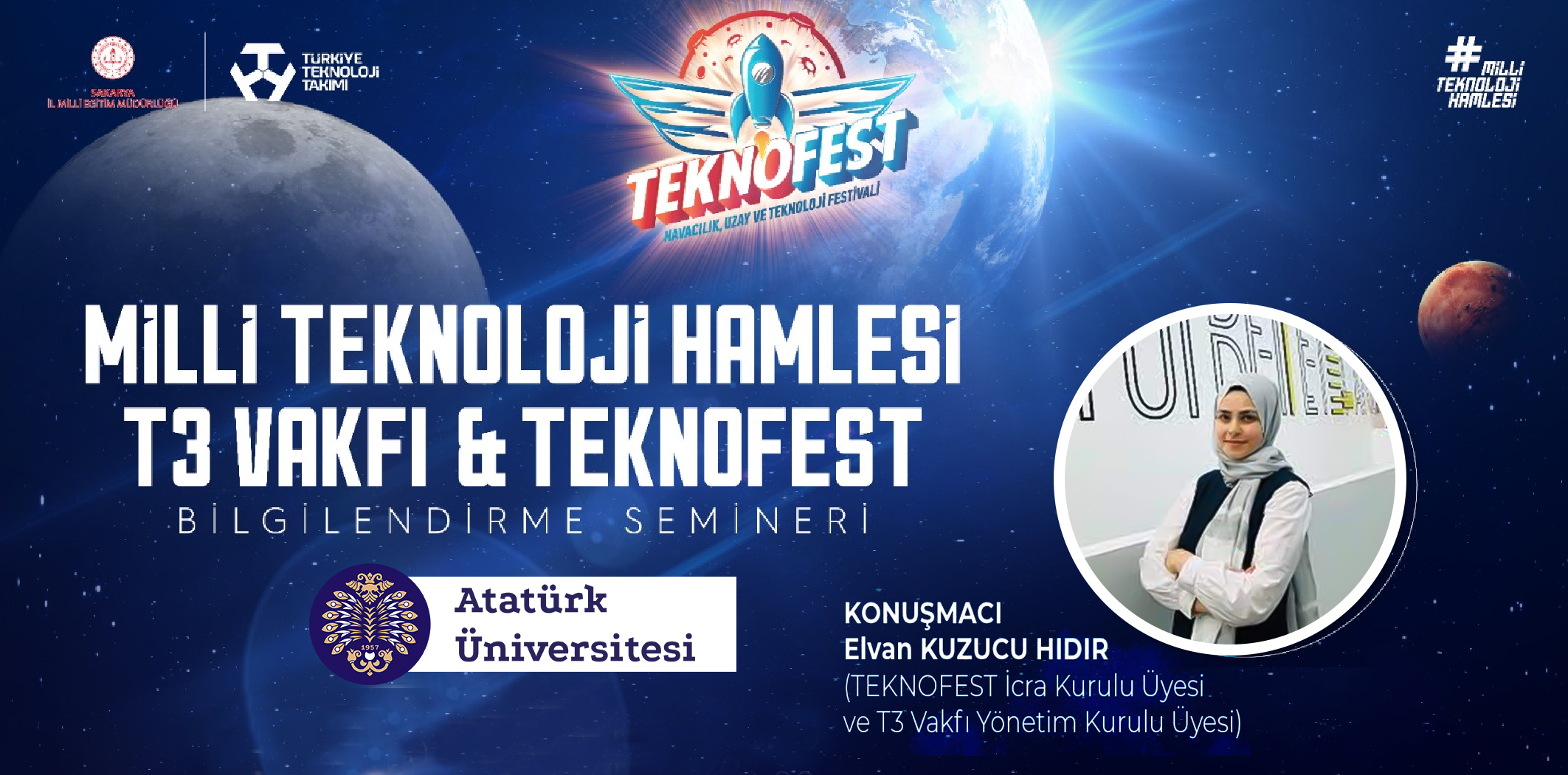 Geçen yıl 1 milyon 720 bin ziyaretçinin katılımıyla İstanbul’da düzenlenen, bu yıl ise Millî Mücadele ateşinin yakıldığı Samsun’un ev sahipliğini yapacağı TEKNOFEST 2022 için TEKNOFEST İcra Kurulu Üyesi ve T3 Vakfı Yönetim Kurulu Üyesi Elvan Kuzucu Hıdır'ın sunumuyla bir toplantı düzenlendi. Çevrimiçi (online) olarak gerçekleşen programa Atatürk Üniversitesinin yanı sıra; Kastamonu Üniversitesi, İstanbul Cerrahpaşa Üniversitesi, Giresun Üniversitesi, Yıldız Teknik Üniversitesi ve Ankara Üniversitesi katılım sağladı.