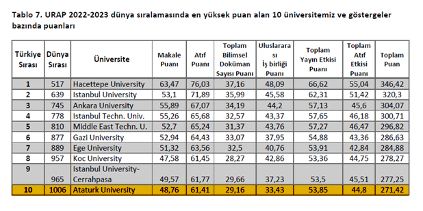 Bu yıl kuruluşunun 66. yılını kutlayan, Türkiye’nin en tecrübeli ve donanımlı üniversitelerinden birisi olarak bölgesine, ülkesine ve bilim dünyasına önemli katkılar sunan Atatürk Üniversitesi, bilimsel alanda yaptığı çalışmalar ile dünya üniversiteleriyle rekabet etmeyi sürdürüyor. Bu kapsamda özellikle üniversite tercihi yapacak öğrencilerin merakla beklediği ODTÜ Enformatik Enstitüsü bünyesinde yer alan University Ranking by Academic Performance (URAP) Araştırma Laboratuvarı tarafından yapılan araştırmalar sonucunda 2022-2023 yılında yayınlanan makale puanı, bilimsel doküman puanı, doktora puanı, öğretim üyesi/öğrenci sayısının total puanına göre 183 üniversite sıralandı.