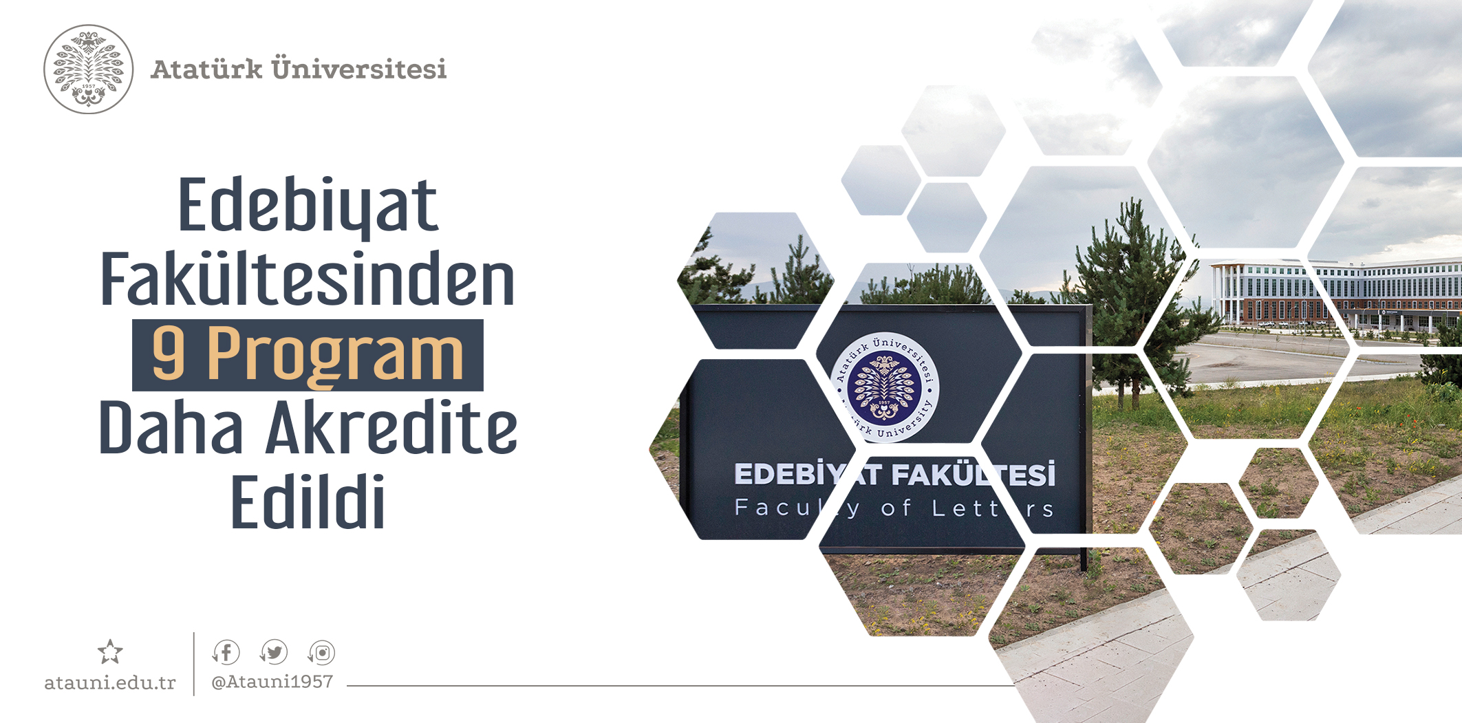 Her geçen gün yeni fakülte ve programları akredite olan Atatürk Üniversitesinde Edebiyat Fakültesinden 9 program daha akredite olmaya hak kazandı. Arkeoloji, Coğrafya I, Coğrafya II, Çağdaş Türk Lehçeleri ve Edebiyatları, Felsefe, İngiliz Dili ve Edebiyatı, Sanat Tarihi, Sosyoloji ile Türk Dili ve Edebiyatı programlarının akreditasyonu için yapılan başvurunun ardından değerlendirme ve karar süreci tamamlanarak programlar akredite edildi.