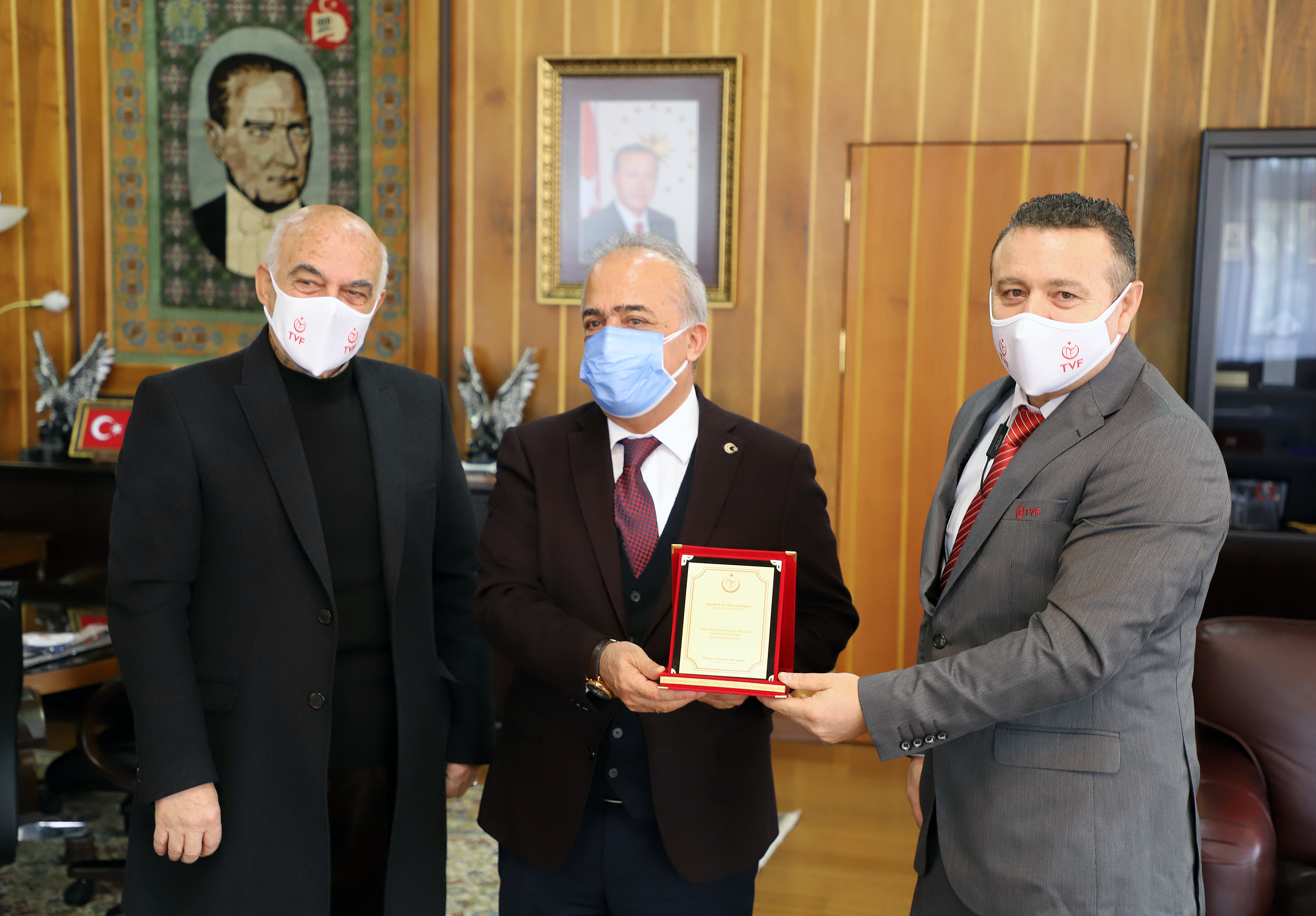 Ziyaretin ardından Voleybol İl Temsilcisi Aytekin Gültekin Rektör Çomaklı’ya spora ve sporcuya yönelik desteklerinden dolayı plaket sunumunda bulunurken TVF Gözlemcisi Necdet Seven de hediye takdim etti.