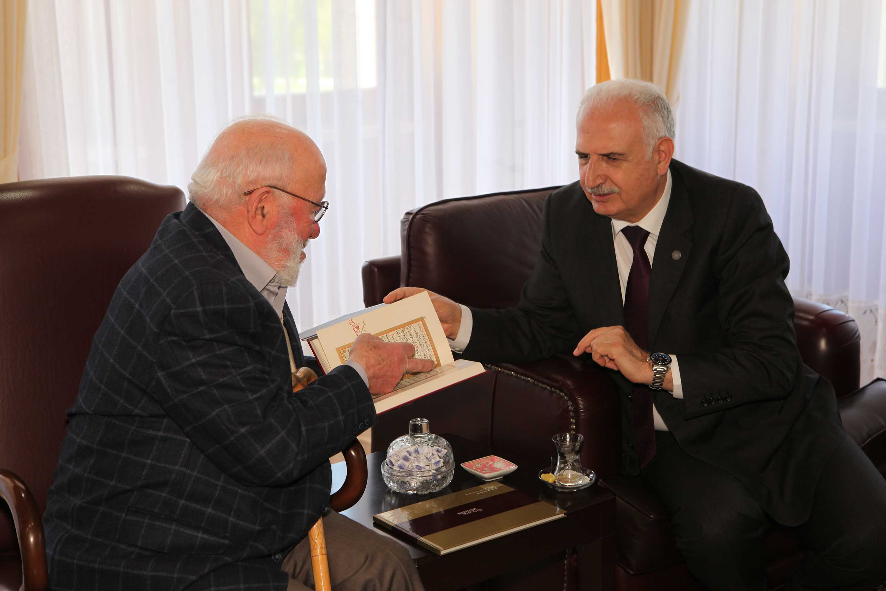 Rektör Prof. Dr. Hikmet Koçak ayrıca ziyaretin anısına yılın ahisi İbrahim Tunç’a el yazması Kur’an-ı Kerim’in tıpkı baskısını ve İbrahim Hakkı Hazretlerinin Tevfiznamesi’ni hediye etti.