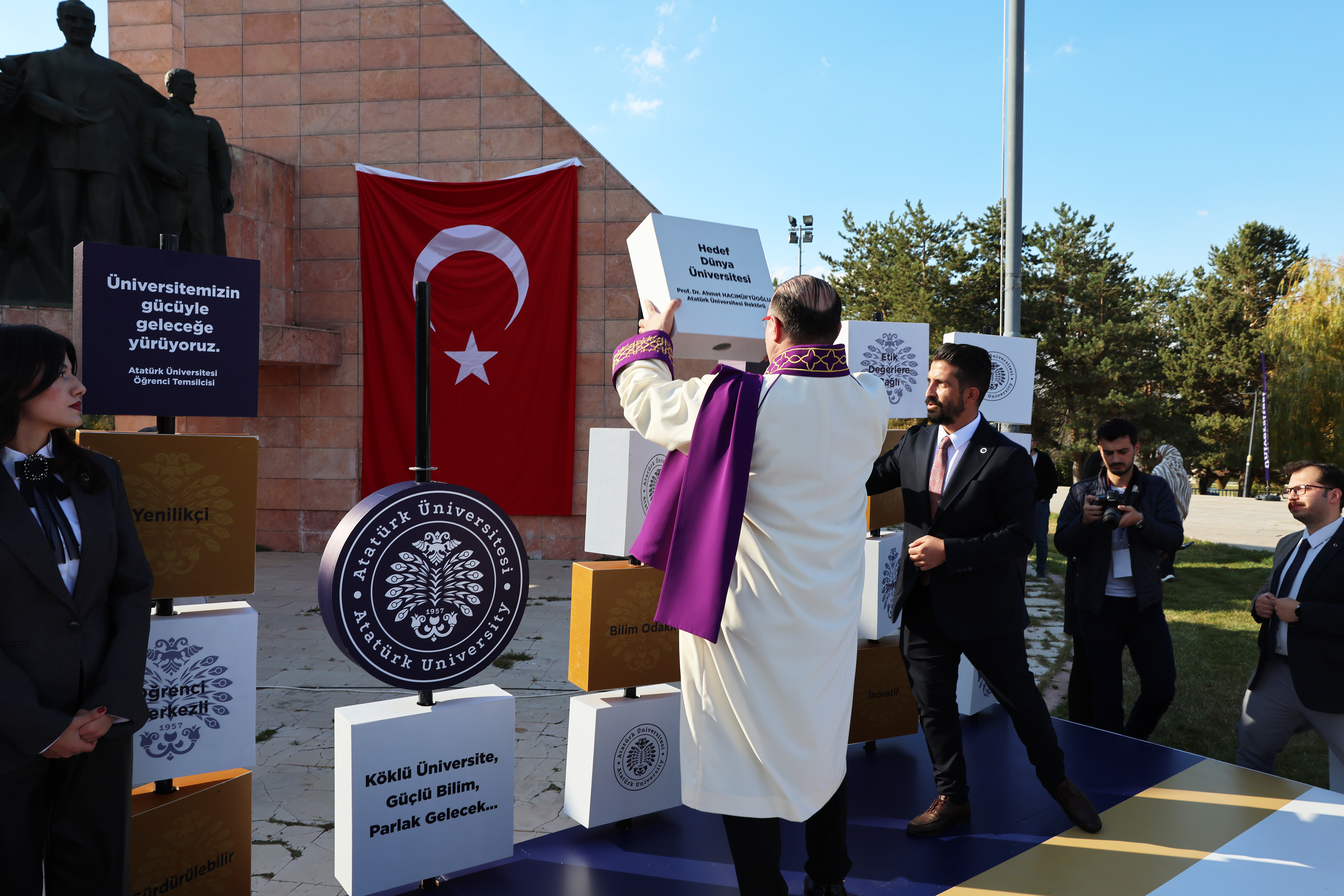 Üç bölümden oluşan kitabeler, üniversitenin gücünü oluşturan temel unsurları simgeledi: öğrenciler, akademik ve idari mensuplar ile ülkemizin yükseköğretim vizyonu. Bu kapsamda, ilk olarak Atatürk Üniversitesi öğrencilerini temsilen bir öğrenci, “Üniversitemizin gücüyle geleceğe yürüyoruz” mesajını Bilim Kitabesine işledi. Ardından Rektör Prof. Dr. Ahmet Hacımüftüoğlu, üniversitenin bilimsel birikimini ve küresel vizyonunu temsil eden “Hedef Dünya Üniversitesi” mesajını kitabe üzerine nakşetti. Ritüelin son aşamasında ise Yükseköğretim Kurulu Başkanı Prof. Dr. Erol Özvar, 2025-2026 Akademik Yılının hayırlı olması temennileriyle Bilim Kitabesini tamamladı.